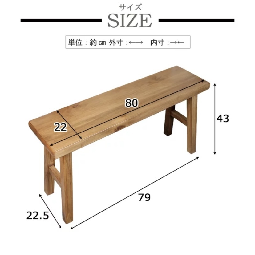 ◆◇商品詳細◇◆ パイン材ベンチL 北欧デザインの素敵な木製ベンチ。パイン家具新入荷です。材質は軽くて持ち運びに便利なマツ科のパイン材です。ナチュラルな木目模様が特徴的で、軽さの割に丈夫な木材です。ウレタン塗装済み商品ですので、色移り、傷汚れが付きにくい質感です。シンプルでやさしいお色が高級感、アンティーク感があり、大人気商品。スツールにはもちろん、サイドテーブル、花台やショップのディスプレイ、おしやれなマルチ台として使い方は様々です!座面が広めで安定感があり、丈夫で、すごく座りやすい商品ですよ!人気新商品が今だけこの価格!他では買えない商品をぜひこの機会に♪ 【商品状態説明】 小キズ、少々の色むらあり、まずまずの美品。 完成品になります。 ・こちらの商品は、現品画像ではありません。 在庫の中から丁寧に検品後、アウトレット商品を発送いたします。 【サイズ】 横幅:80㎝(座面) 奥行:22㎝(座面) 高さ:43cm 足幅約79cm 【素材】 パイン材、松材無垢 【カラー】 ブラウン 【参考価格】 ¥14,800 | ◆◇発送方法◇◆ ●送料は基本無料ですが、沖縄・離島などにお住まいの方はご負担ください。 (沖縄・離島の方はメールにてご連絡いただければ、送料をお知らせいたします。) ●ヤマト運輸・佐川急便・第一貨物のいずれかにて配送いたします。 (運送会社の指定はできません。ご了承ください。) ●日時・時間指定のある方や、お問い合わせ(追跡)番号をご希望の方は取引連絡の際にお知らせください。 | |
