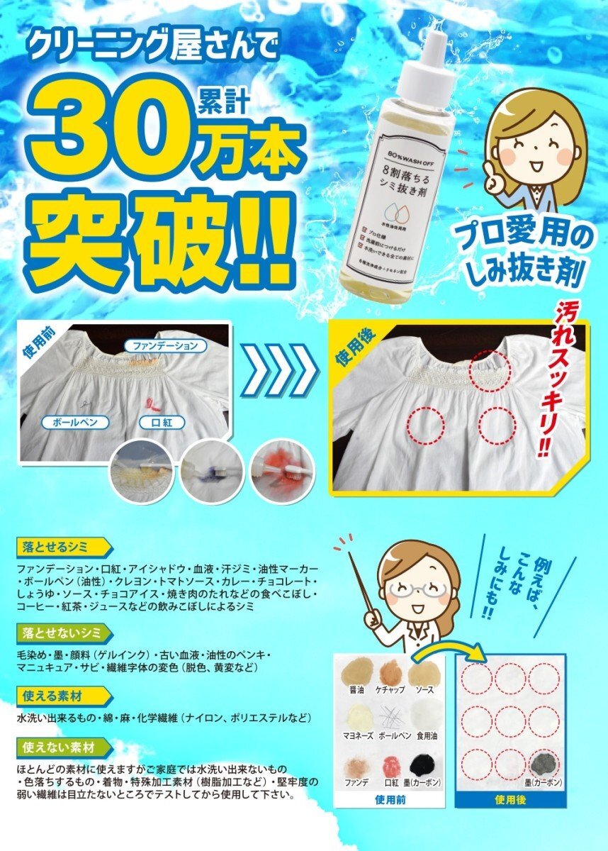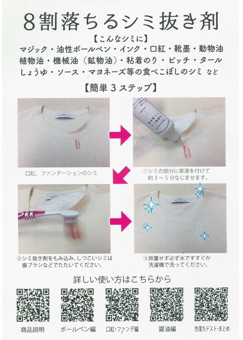 プロ愛用のしみ抜き剤 洗濯前につけるだけ!水洗いできる全ての素材に ◆用途 ・マジック、油性ボールペン、インク、口紅、粘着のり、ワイン、しょうゆ、ソース、マヨネーズ、サラダ油、ドレッシング、トマトソース等の食べこぼしのシミなど |