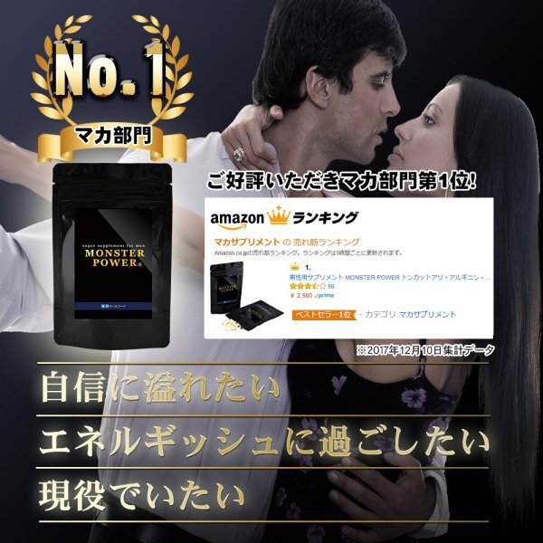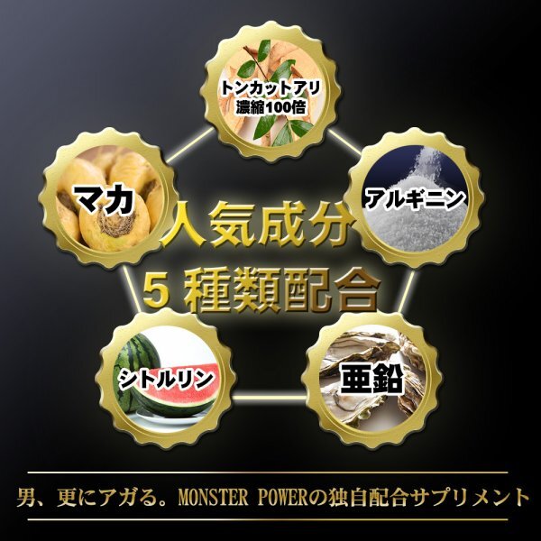 | 【成分】 | L-アルギニン、トンカットアリエキス末、 酵母(セレン、亜鉛含有)、有機マカ末、L-シトルリン、 ドロマイト(炭酸Ca・Mg含有)、ゼラチン(ブタ由来) |