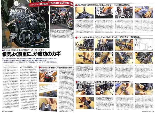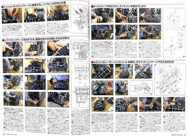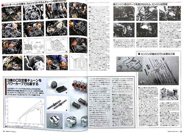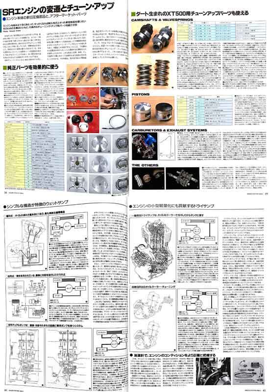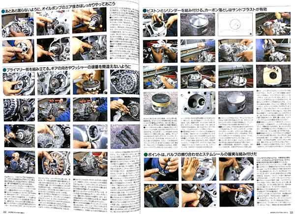 「エンジン組み立て・チューンアップ編」特集が24ページ掲載されている雑誌です。 …………………………… ---●エンジンの組み立てとチューニングアップ。惟は誰にでも楽しめるホビーだ ---●PART 1 ヤマハSR チューニングしながら組み立てる 〜どうせ組むのならパワーアップもしよう ・クランクベアリングの圧入はプレスで行う。オイルポンプを装着しておく ・クランクシャフトとミッションを組む。たっぷりとオイルを塗ってやる ・プラスチックハンマーでたたいて、左右のクランクケースを合わせる ・あとあと困らないように、オイルポンプのエア抜きはしっかりやっておこう ・プライマリー側を組み立てる。ギアの向きやワッシャーの順番を間違えないように ・ピストンとシリンダーを組み付ける。カーボン落としはサンドブラストが有効 ・ポイントは、バルブの擦り合わせとステムシールの確実な組み付けだ ・メカノイズの低いエンジンを組み立てたいなら、バルブまわりの部品は新品が望ましい ・シリンダーヘッドを載せて、カムシャフト廻りを組む。初期潤滑を充分にしよう ・完成したエンジンを車体に積むマウントボルトはスプロケットの近くから納める ・そしてキック一発!エンジンが目を覚ましたらオイル系のチェックをしよう ・SRエンジンの組み立てに使用したツール/特集工具/ケミカル ---●SRエンジンの変貌とチューン・アップ 〜純正パーツを効果的に使う 〜ダート生まれのXT500用チューンアップパーツも使える ---●PART 2 ホンダCB1000スーパーフォア 〜根気よく慎重に、が成功のカギ ・バルブのすり合わせを行った後、シリンダーヘッドに組み付ける ・コンロッドを装着したクランクシャフトを、アッパークランクケースに収める ・ACジェネレータを付ける。ただしシャフトナットはまだ締めない ・ミッションをクランクケースに装着する。ノックピンの向きに注意。 ・上下クランクケースを合わせる。最良の合わせ状態にするのが肝心 ・オイルポンプを取り付け、オイルパンを閉めてしまう ・ACジェネレーターシャフトを締め、ギアシフトリンケージやセルを付ける ・ピストンは、装着時にキズを付けないようにする。ピストンリングの扱いにも注意 ・シリンダーにピストンを入れるときは、ケースと水平に保ち続けるのがポイント ・エンジンを車体に搭載する。降ろすのと同じく、作業は二人行うと楽 ・ディスクやクラッチセンターの摩耗をチェックし、クラッチを組んでいく ・シリンダーヘッドを乗せ、カムシャフトやカムチェーンを取り付ける ・エンジン周辺パーツを取り付けたら、エンジンは完成 ・エンジンの組み立てに必要な工具 ・3種のCB定番チューンをパワーカーブで比較する ---●4サイクルエンジンのチューニングアップ 〜混合機を的確に吸入・排出させる司令塔、カムシャフト 〜ピストン形状は、チュナーのポリシーを反映する 〜オイルクーラーの性能を表すスペックとは 〜特別講座;潤滑系の構造を知れば、トラブルを防げる ・シンプルな構造が特徴のウェットサンプ ・エンジン小型軽量化にも貢献するドライサンプ ・油温計で、エンジンのコンディションをより性格に把握する …………………………… ○ 30年以上前のバイク雑誌BS、一冊の出品です。 ○ 細かい発行年などの質問はご容赦ください。 ○ 程度は表紙にスレがありますが大きな傷み等はありません。 よろしくお願いいたします。92 250912 |