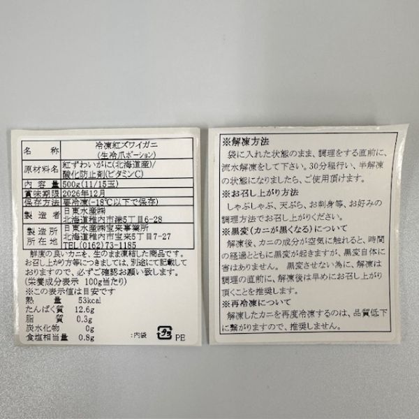 規 格:紅ズワイガニ(北海道産)/500gパック×2パック/1袋11-15玉規格