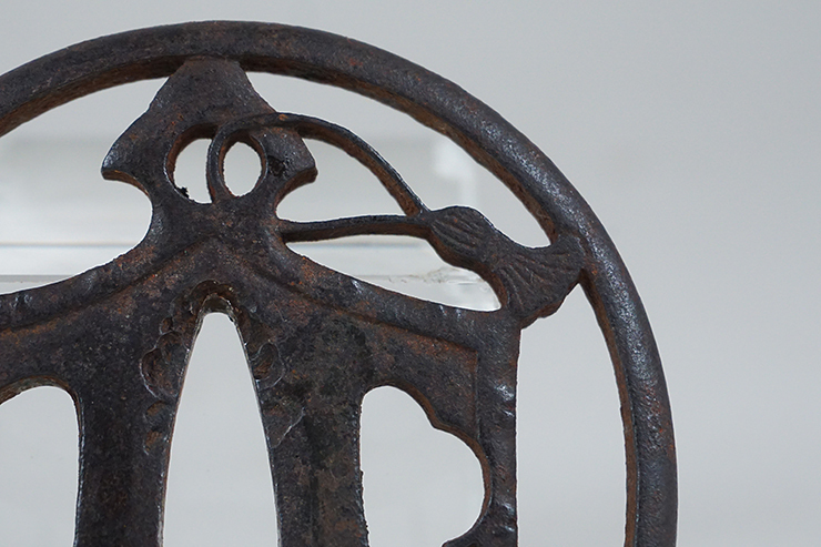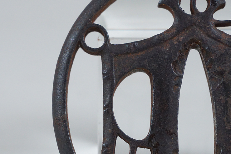 | 鐘透かし、時代鉄鐔です。大変透かし彫りの丁寧で繊細な鐔です。 大きな傷み、ヒビなどありません。画像ご参考の上ご入札ください。 巾74.6×72.2×7.0mm 茎孔29.3×9.0mm 重さ105g | ||