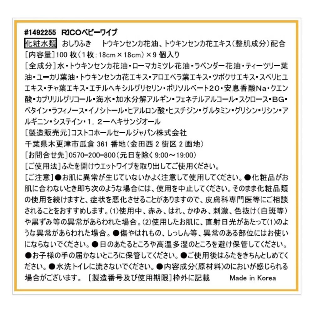無香料、パラベンフリー、アルコール(エタノール)フリー、無塩素漂白パルプ素材の赤ちゃん用おしりふき フランス製の超純水と保湿成分であるアクアクリーム*配合 赤ちゃんの肌を柔らかくする整肌成分のトウキンセンカ花油、トウキンセンカ花エキス配合 コストコからNEWおしりふきが登場しました! 厚さは、カークランドのベビーワイプと同等で、使用感もカークランドより良いと評判です。 また、匂いがしないので、RICO ベビーワイプを選ばれる方が多くなってます。 最後の一押しは、カークランドの商品と比べて『価格が安い』です。 今後、コストコの主力商品になりそうな勢いです。 是非、使って見てください。 |