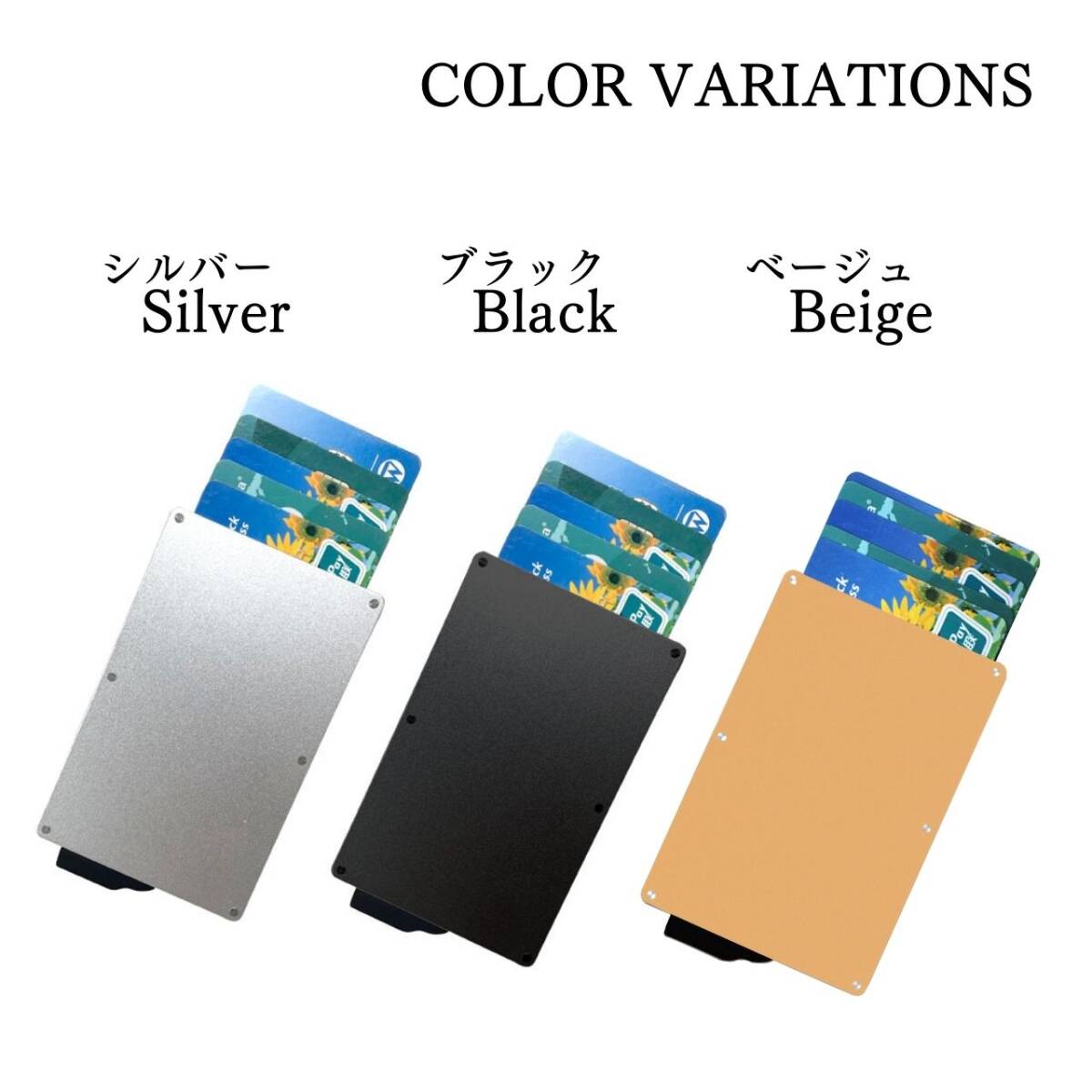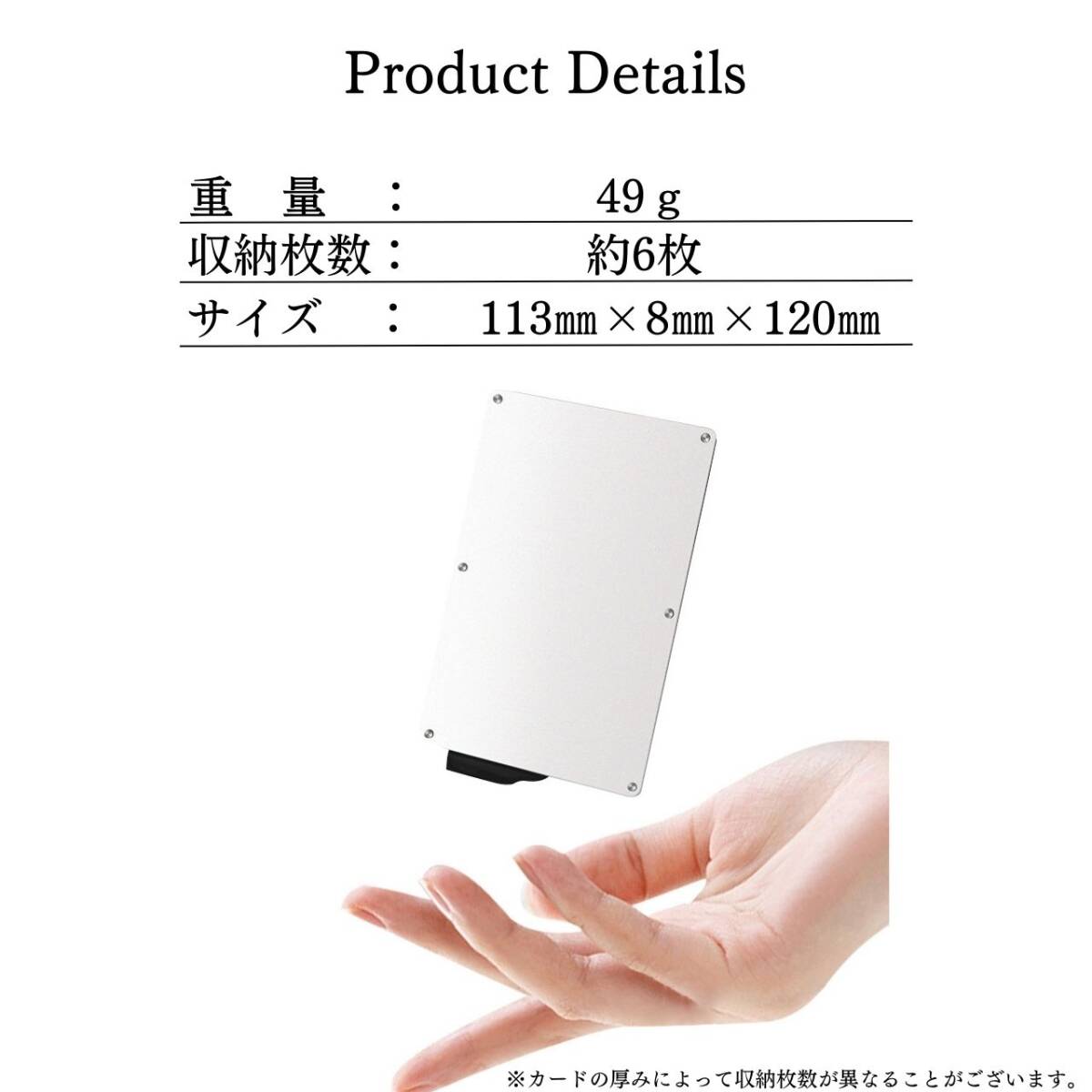 【スキミング防止】コンパクトながらもスキミングからあなたを守るカードケース!ミニマリスト必須アイテム!【アルミニウム合金】アルミニウム合金で耐久性に優れ、軽量で移動中の方に最適なアクセサリー。ミニマリストなデザインで、ポケットやバッグに入れてもかさばりません。【革新的】革新的なスライダーでスムーズなカードの取出し。レバーをスライドするだけで必要なカードがスムーズに出てきます。 コンパクトなデザインで、ポケットやバッグに快適に収納でき、カードを6枚収納できます。【カラー】タイトル、商品画像1枚目をご確認ください。【サイズ】重量:49gサイズ:113mm×8mm×120mm【収納枚数】約6枚【注意事項】・海外製品のため、多少の傷や汚れ等ある場合がございます。・送料の都合上簡易包装での発送となります。コメントなしでの即購入可能です。おまとめ買いでお値引きさせていただきます。お気軽にコメントください。ワンタッチ 軽量 スキミング防止 収納 カードケース カードホルダー スリム スタイリッシュおしゃれ 便利 ブラック シルバー ベージュ 黒 白 銀 茶 磁気防止 名刺入れ メタリックプレゼント ミニウォレット 旅行