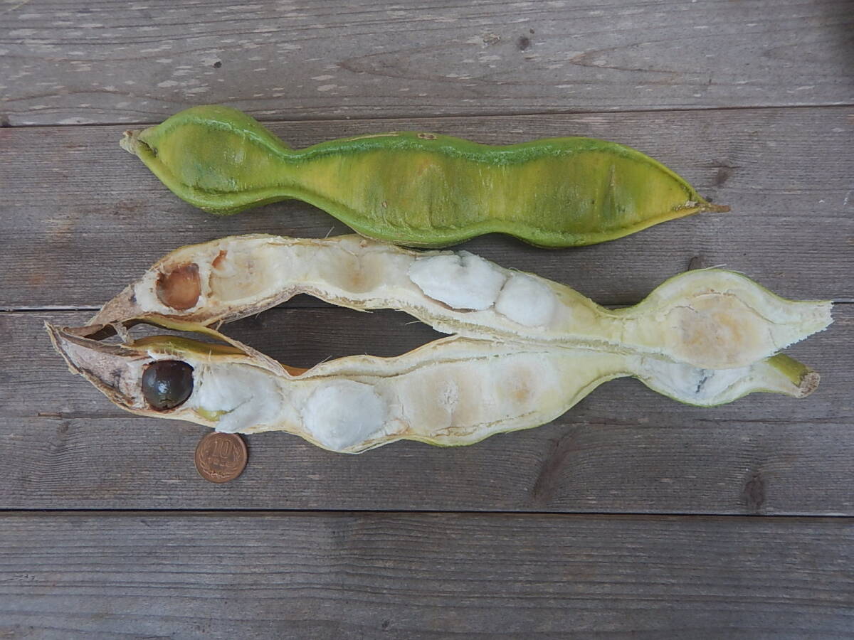果実は1mほどの円筒状のさやで、中に白いふんわりした果肉で覆われた緑の種があります。