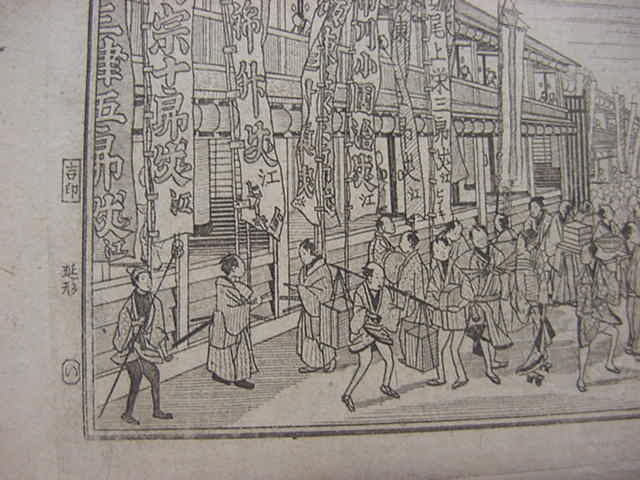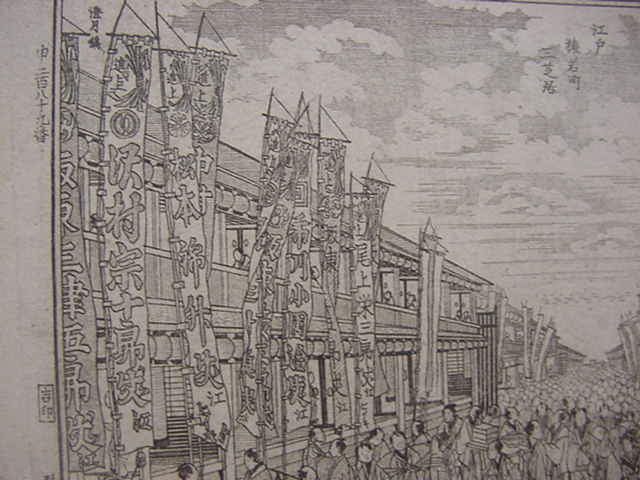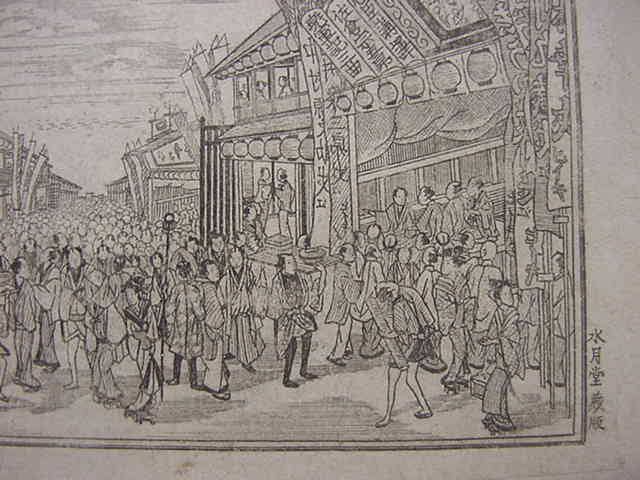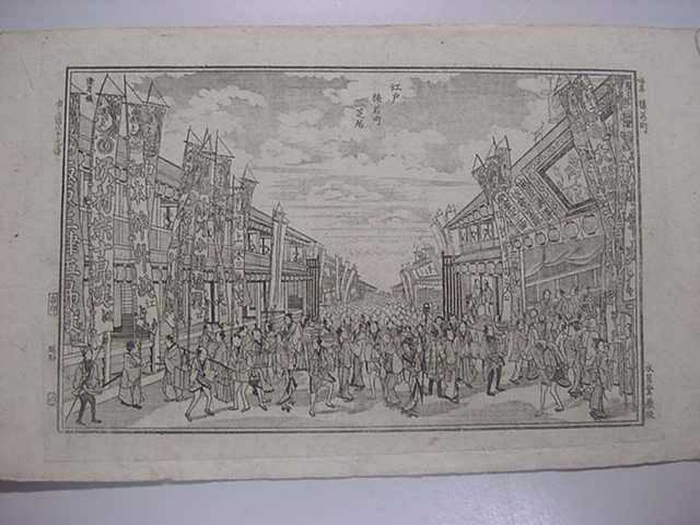 江戸時代安政ごろに刊行された銅版オリジナル刷りもの『江戸猿若町三芝居』全1舗です。15cm9cm。岡田春燈斎水月堂版。江戸時代の江戸猿若町芝居小屋の賑わいを描いた傑作です。銅版だからたいへん細かい描写が特徴です。保存状態も概ねよい方です。まず市場には出てこない極めて貴重な原資料をお見逃しなく!残念ながら写真ではうまく映ってはいませんが細かくはっきりしたよい作品です。