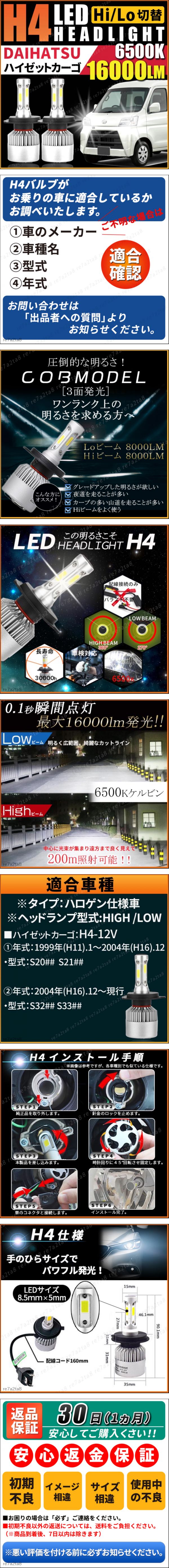 | 商品説明 | 【商品説明】 自動車用 H4ハロゲンバルブ交換用2個セットです。 <適合車種> ■車 種:ハイゼットカーゴ専用 ■用 途:LEDヘッドライト ■仕 様:純正ハロゲン車 ■装着バルブ:Hi/Lo H4対応 ■作 業:オールインワン一体型で純正バルブの取替 ■車検対応品:各エリアの検査官により差があるため 専門店へもご相談ください。 ========================================= 【適合型式】 ① S20## S21## (1999年01月 ~ 2004年12月) (平成11年1月 ~ 平成16年12月) ② S32## S33##(2004年12月 ~ 現行) (平成16年12月~現行) ========================================= ■適合に関しては、オプション、グレード等により装着されている バルブが一部異なる場合もございます。 必ず現車にてご確認下さい。 ■ご不明な点がございましたら、お気軽にご質問ください。 ________ 【詳細情報】 ケルビン数 : 6500K 輝度 : LO:8000LM Hi:8000LM(合計16000LM) LEDチップ : COB全面発光チップ 本体材質 : アルミ合金 電源 : 9~32V 消費電力 : 36W 商品サイズ : 約90mm×35mm 防水標準 : IP65 使用温度 : -40℃~80℃ 製品寿命 : 30,000時間以上(約15年) ________ 【配送方法】 ・宅急便コンパクト(匿名配送) 【安心保証】 ・1ヵ月以内の不具合につきましては無償での お取替えを実施いたします。 ________ |