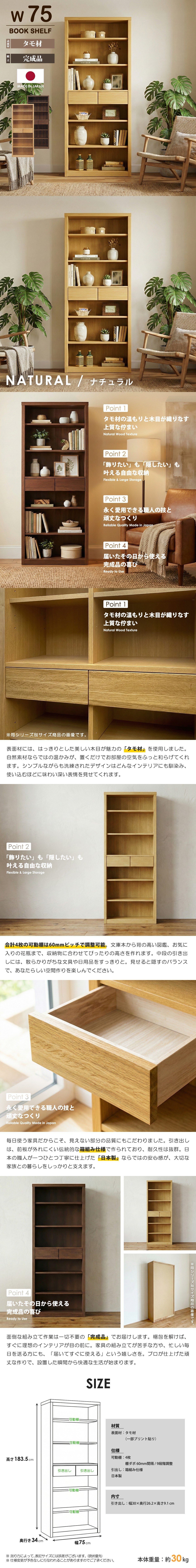 | 特 徴 | タモ材の美しい木目が空間に温かみを添える、日本製のフリーボード。 幅75cmの頼もしい収納力で、本棚としてはもちろん、お気に入りのコレクションを飾るディスプレイラックとしても活躍します。小物整理に便利な引き出しも備え、見せる収納と隠す収納を両立させました。 | | 商品サイズ | 本体:幅75×奥行34×高さ183.5cm 引き出し内寸:幅30×奥行26.2×高さ9.1cm