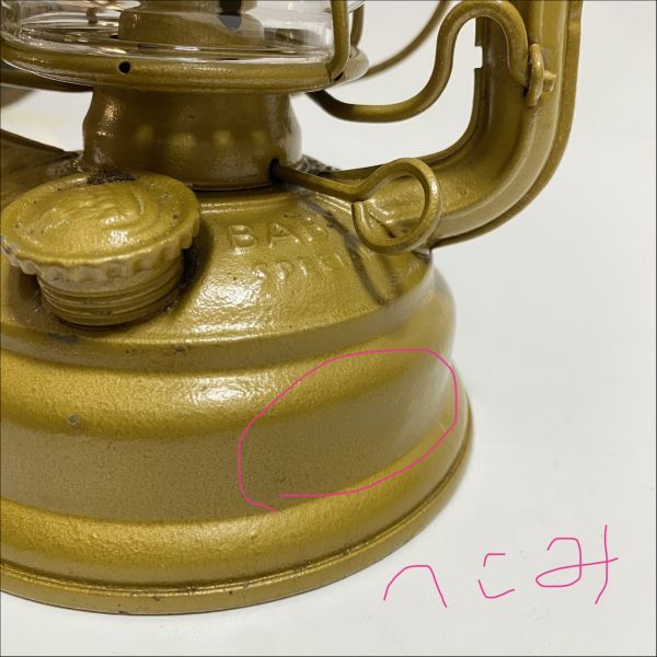 | ご覧いただきありがとうございます。 1902 年創業のドイツの老舗ランタンメーカーFeuerhand(フュアーハンド)社の、ハリケーンランタンです。 stkとはSturmkappe(風防)の略称。現行モデル276とサイズは同じですが、風防付きの廃盤モデルです。 再塗装されています。 鮮やかな黄色ではなく、少しくすんだ感じの黄色です。 風防の上部フチの部分にへこみと塗装剥げがあります。 タンクの側面にわずかなへこみがあります(追加写真)。 ホヤは欠けなくきれいです。 ウィックの上下、バーナー部脱着、燃料キャップの脱着、リフターの上下など可動箇所に問題ありません。タンクの漏れありません。 本体高さ 26cm | ||