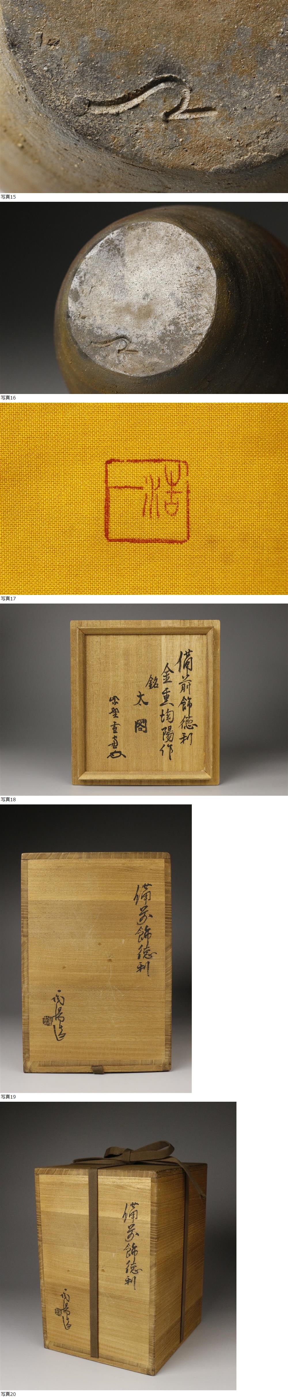 26022819* * * 商品詳細 * * * ここでしか出逢うことのできない唯一の美をご紹介させて頂きます。 景色は美しく豊かな色彩を感じさせる備前焼壷のご紹介です。 底には作家の陶印が刻まれています。 窯内部の熱気を感じさせる鮮やかな変化は素晴らしく、唯一の魅力が楽しめます。 造形も端正で美しく、気品ある佇まいをした逸品です。 この機会に是非お求めください。 ■商品内容/壷、布、合箱 ■サイズ/横15cm×高20.5cm 箱:横18.5cm×高28cm×奥行20.8㎝ ■状態/スレ、キズ、窯被、箱にスレ、キズ、シミ、汚れがございます。 ※写真にてご確認、ご了承の上ご入札下さい。 * * * 支払詳細 * * * !かんたん決済 * * * 発送詳細 * * * 入金確認後3営業日以内に発送致します。 ※直接引き取りも可能です。 60~160サイズにつきましては 佐川急便、ゆうパックのどちらかで発送いたします。 ゆうパック発送の場合、弊社の発送日から追跡サービスに問合せ番号が反映されるまで 約1日ほどお時間がかかりますのでご了承下さい。 * * * 注意事項 * * * 運送中の破損があった場合は速やかに当社までご連絡下さい。 保険を利用するのに受取連絡後に運送会社による現場での破損状況確認が必要となります。 勝手に返送されますと保険の適用外となりますのでご注意ください。 * * * * * * お問い合わせ:082-236-8669 |