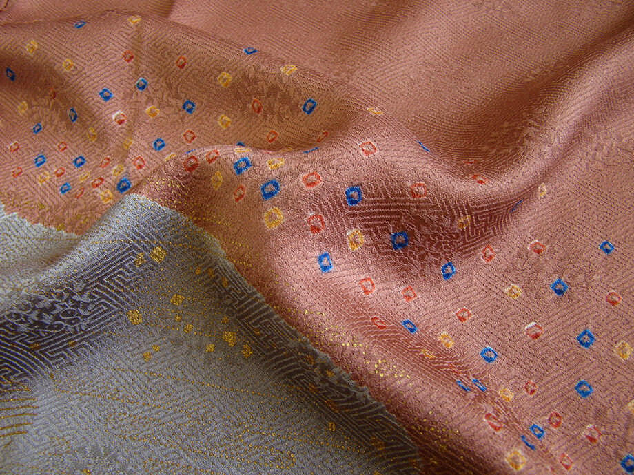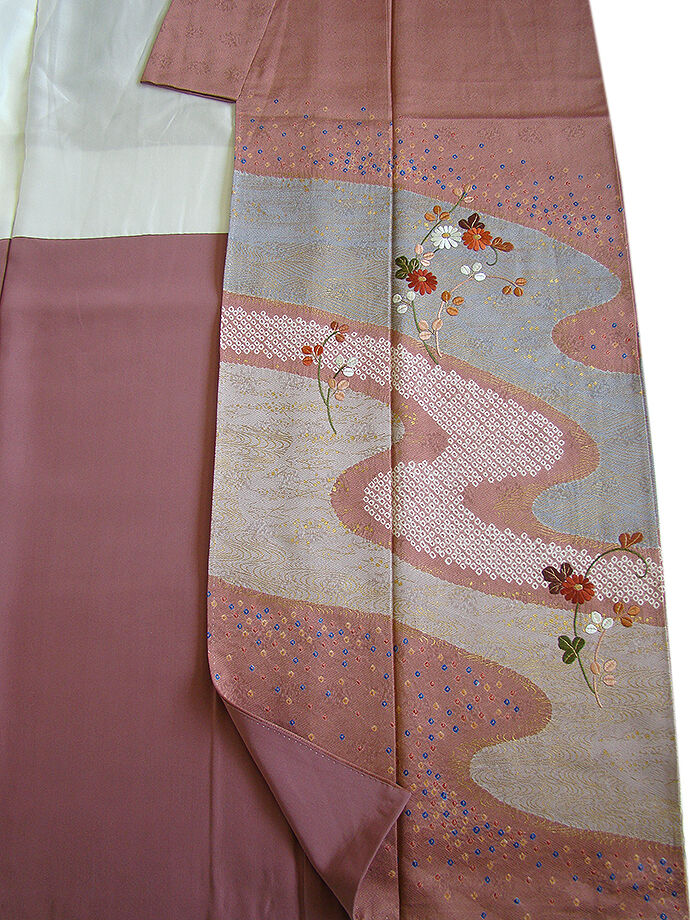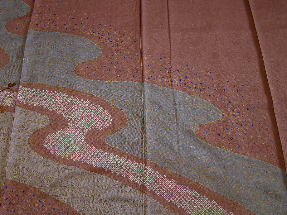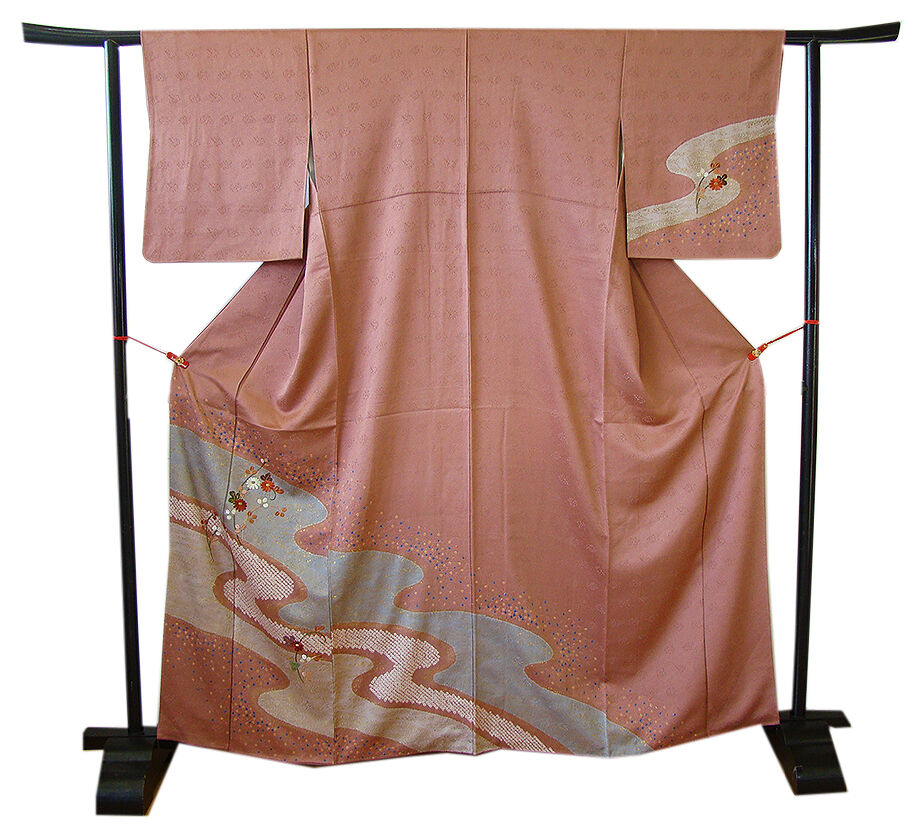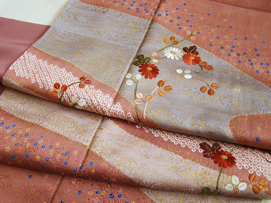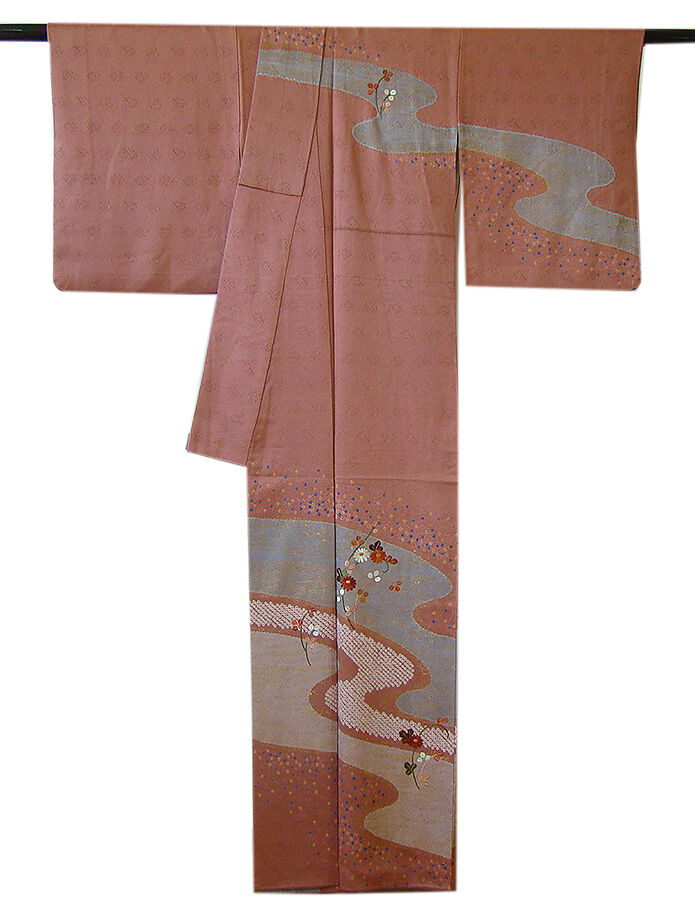 | 商品説明 | こちらのお品は「袷」ですので10月から5月までお召頂ければと思います。 しなやかで柔らかな手触りの着心地良い重めの紋意匠地の生地、 蘇芳香色地に薄柿、鼠色ぼかしに地模様入り、鹿の子絞りに流水柄等の金彩加工染に 花草柄の刺繍入り、 八掛は浅蘇芳色(正絹)、幅広い年代の方にお召頂けます。 |