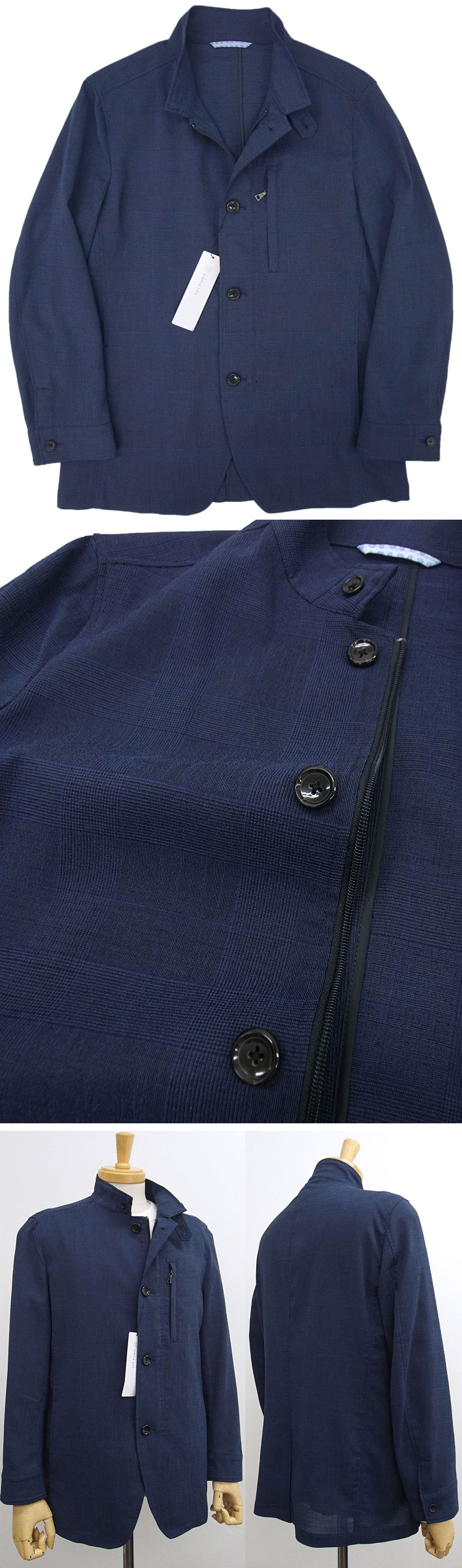 ●ジャケットをベースにスタンドカラーブルゾンの要素をミックスしたデザイン。衿の折り返しも可能で、腰ポケット・左胸ジップポケットあり。内仕様は前身メッシュ裏と肩部分のみに裏地を施し、袖と背中は裏なしの夏仕様。右胸に内ポケットもあります。