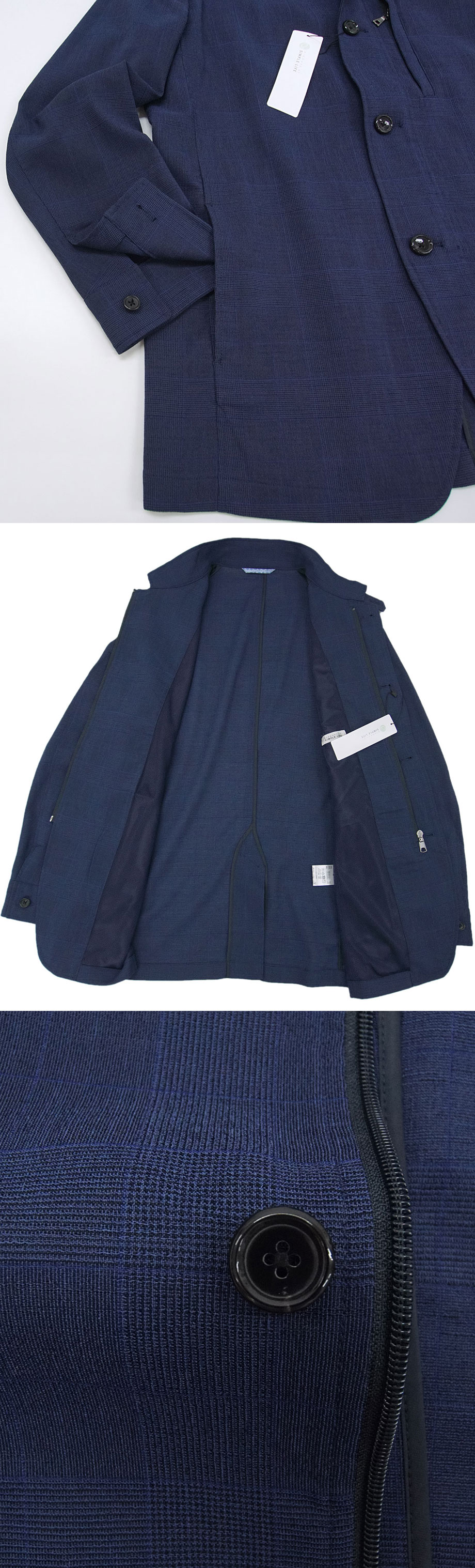 ●強撚糸を使用しているため清涼感が増しサラリとした肌触りに仕上がっています。この手の高機能生地は平坦でのっぺりとした印象のものが多いのですが、こちらはリネン混のウールを思わせるグレンチェック生地で色柄に深みがあり高級感が漂います。春夏ジャケットらしい適度にざっくりとした素朴な雰囲気。速乾性に優れ、しわにもなりにくく、家庭洗濯も可能、シーズンオフの虫食いの心配もありません。