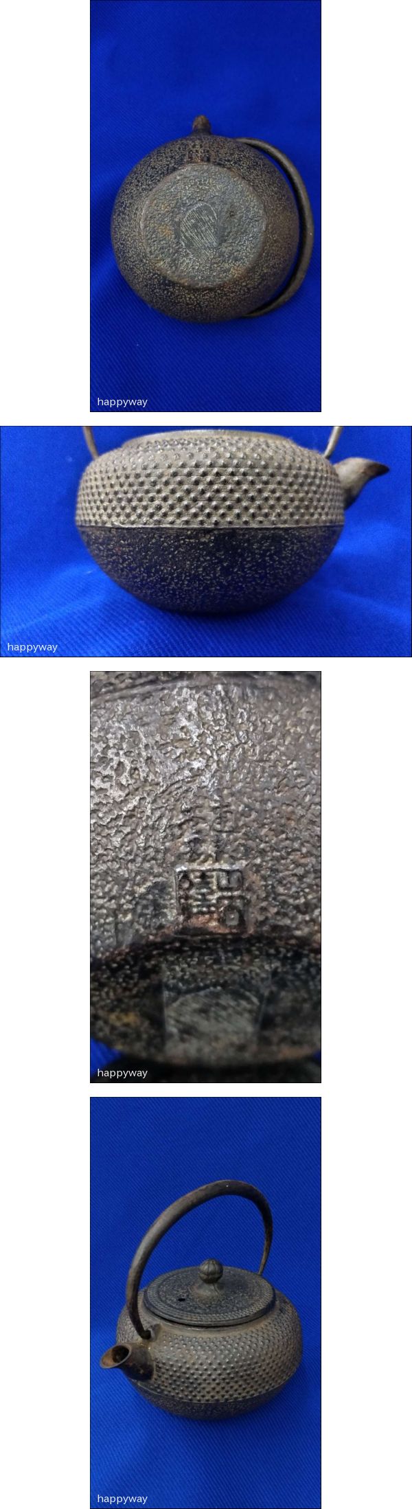 | ご覧頂き、誠にありがとうございます。 迅速・丁寧なお取引を心がけております。 出品詳細を最後まで読んでいただき、入札をご検討下さいませ。 ■商品内容 南部鉄器 本場盛岡 岩鋳作 南部鉄急須 南部鉄瓶 霰模様 工芸品 茶道具 茶器 アンティーク 古美術 骨董 古民具です。 長期保管品のため汚れ等を取る簡単な清掃したのみです。 専門家ではない為、詳しいことなどはわかりません。 商品についての詳しい知識はありません。 個人の感覚の誤差や見逃しがある事もありますので、ご納得のうえ、ご入札をお願い致します。 完品をお求めの方や、過度に状態を気にする方は入札をお控え下さいますようお願い致します。 ※専門外の商品ですので記載事項に誤りがある場合もございますが予めご了承ください。 ■商品サイズ ・約13cm×約11cm×高さ 約8.5㎝(持ち手除く)×口径 約6.3cm 重さ 約486g ※素人採寸のため若干の誤差はご容赦ください。 ■商品状態 長期保管されていた鉄瓶ですので、経年による汚れや細かな擦れキズ、錆などがあります。 御湯を入れて試しましたが水漏れはありませんでした。 箱はありません。 画像の物が全てになります。 ※あくまでも個人の見解になりますので状態は画像でよくご確認下さい。 専門家でないためキズ・ヨゴレ・変色・折れなど見落としがある場合があります。 ご了承ください。 写真でよく確認していただき、納得できる方のご入札をお願いいたします。 * ご注意 * ・画像に写っている物が全てとなります。 ・撮影時の照明等や、お客様のページをご覧になられる環境、(ディスプレイ設定・使用OS・携帯端末の種類) により、実際の商品の色目と多少異なって見える場合がございますので、予めご了承ください。 ・精密な検品を行っておりませんので細かな部分が気になる方はご入札をお控え下さい。 自宅保管の為完璧を求める神経質な方は入札を御遠慮下さいませ。 | ||