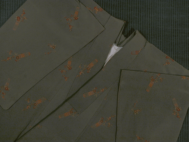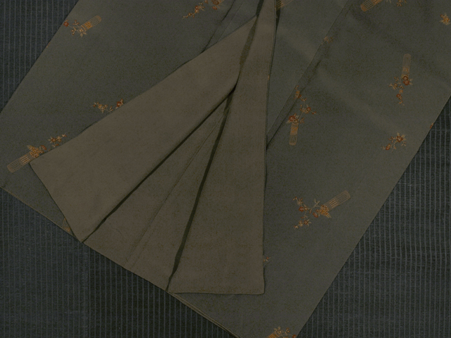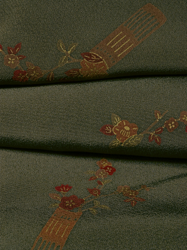 やや茶色味の強い千歳茶色の地に、梅や椿の配された花入れの文様が染められている、縮緬の小紋です。袷仕立てです。 落ち着きのあるモダンな渋みと花入れのかわいらしさが感じられます。さらりとしてなめらかな手ざわりの縮緬地です。 ユーズド品で、胸上付近の両衽裏の胴裏に直径約 5cm のうすじみが 1 か所ずつあるほか、衿鵜粗ニ直径約 5mm-1cm の薄めの黄変が 1、2 か所あります。また、画像ほどは判別はつきませんが、右後袖の袖口下付近に直径約 1 cm のうすじみが 1 か所、下前身ごろの胸下に直径約 5mm のごくうっすらとした変色が 1 か所あります。若干のこまかな色ムラ、くすみ、ヤケ感がところどころにあるものの、いずれもあまり判別はつかず、そのほかに目につく大きなしみやよごれ、褪色などのダメージはないので、気にされない方であればご着用は可能と思われますが、状態ランク=「D」のご着用対象外、リメイク素材用とさせていただきます。 |