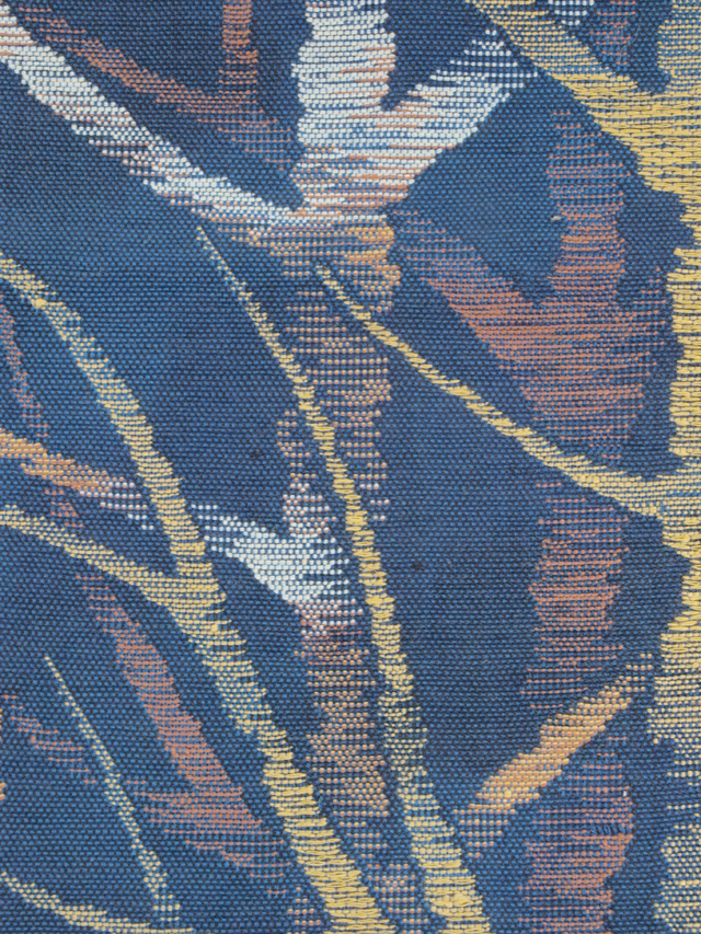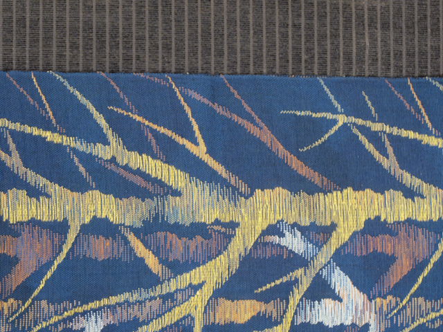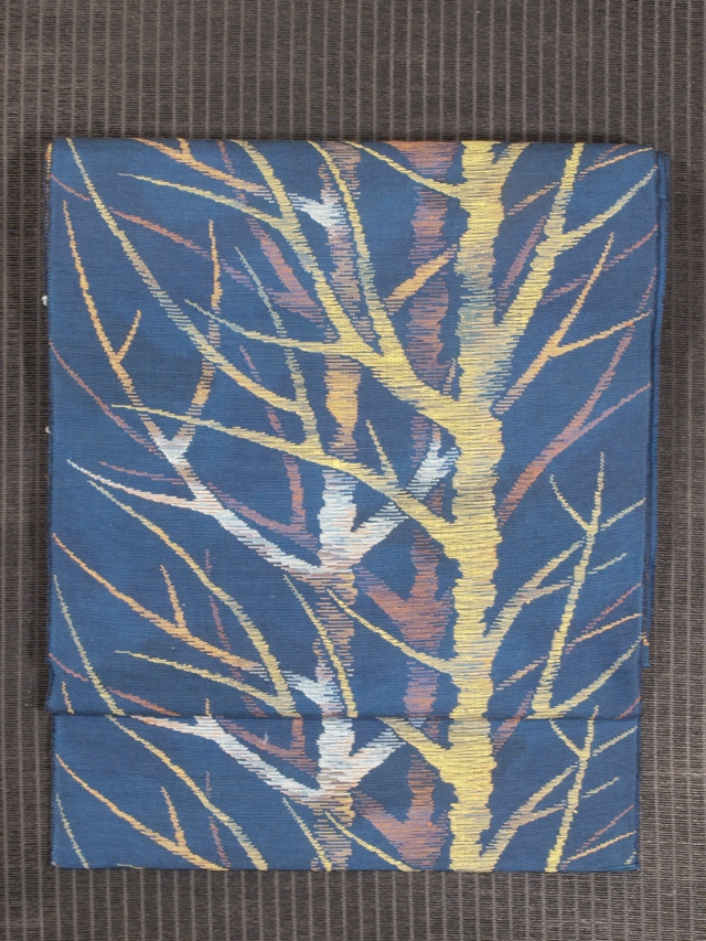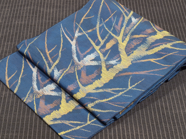 全体的な印象としては、うっすらと濃淡のまだらのある沈んだ濃いめの藍色といった感じの地に、樹林の文様が織り込まれている、紬の八寸名古屋帯です。 葉が落ちて幹と枝になった樹林があらわされた意匠には、寂寥感(せきりょうかん)というよりは、キッチュなお色目とあいあまって、現代絵画のようなデザイン性が感じられます。シンプルですが人目を引く意匠です。ややざっくりとした手ざわりの織地です。 ユーズド品で、ごくうっすらとした前の折り跡がありますが、そのほかに目につくしみやよごれ、褪色などのダメージはなく、きれいな状態です。 |