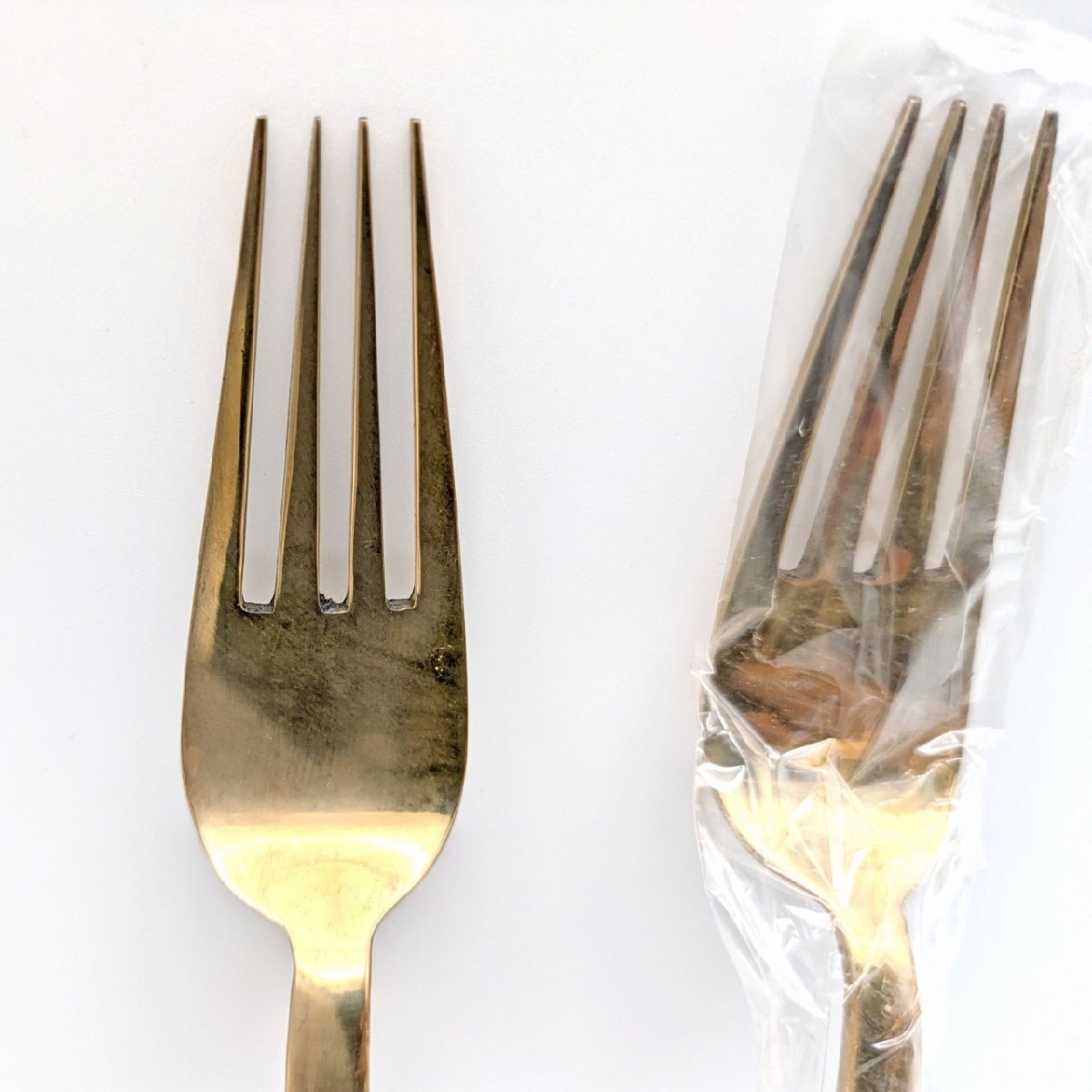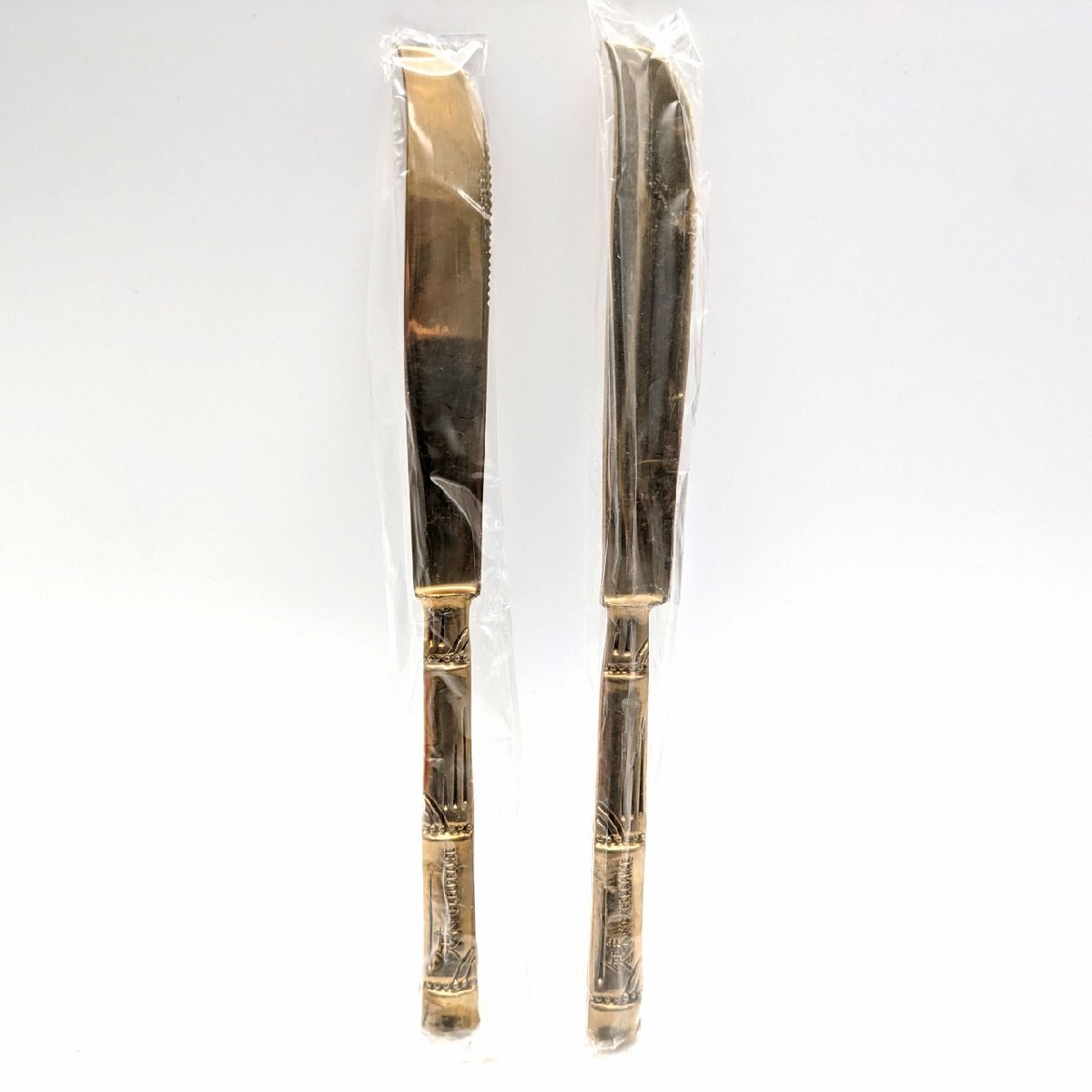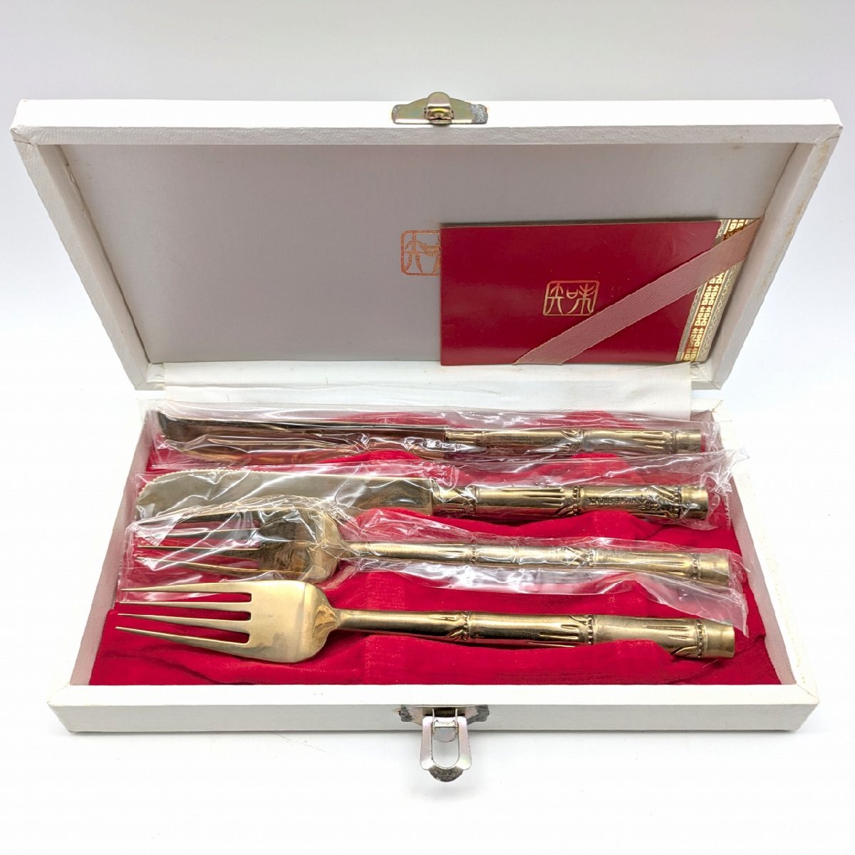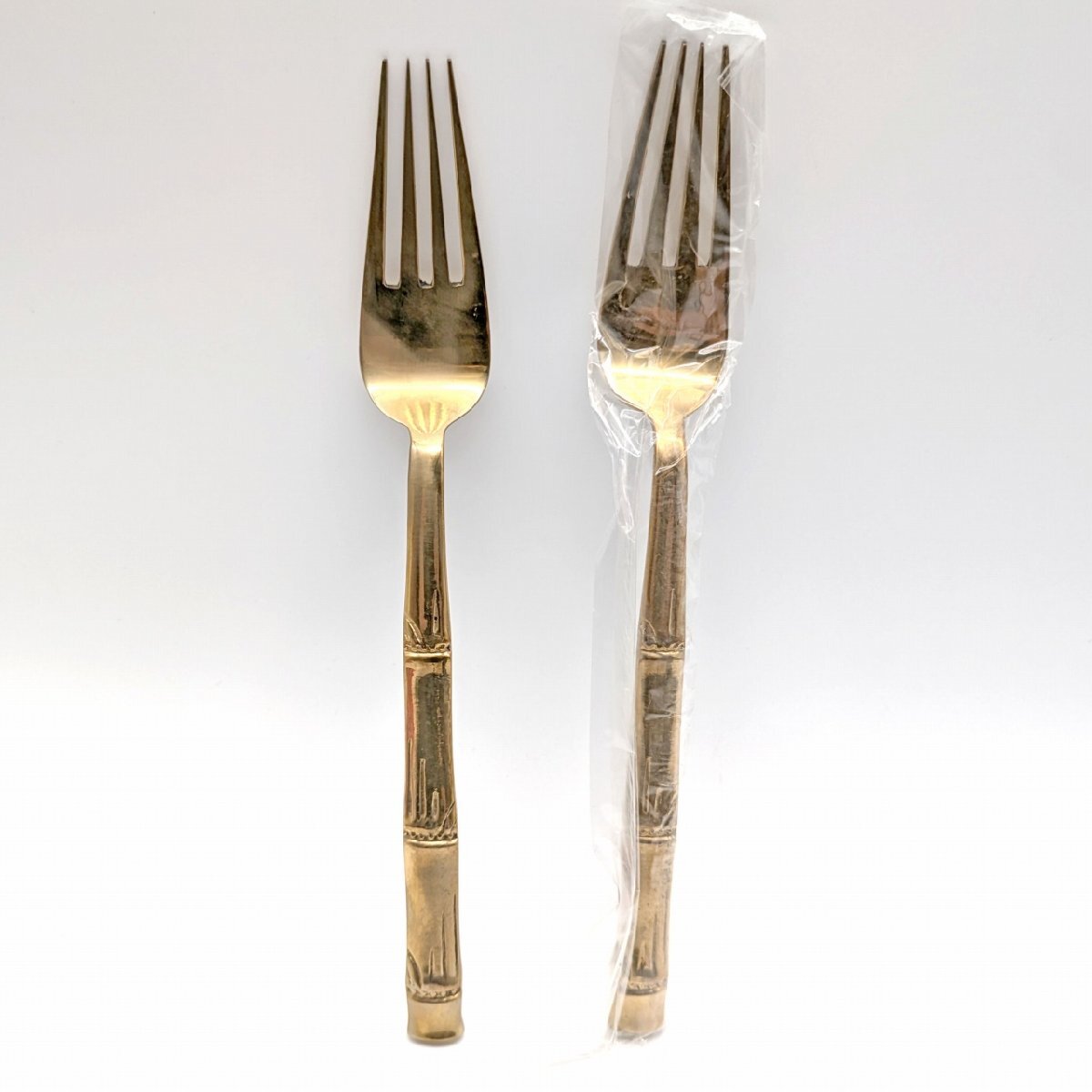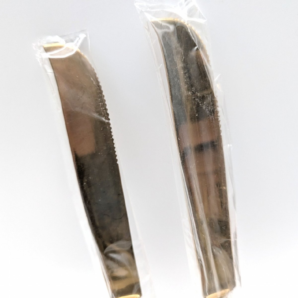 フォーク:約195㎜×2本、ナイフ:約200㎜×2本、計4本セット、状態ランク:C 商品は画像に写っているものが全てです。フォークのうち1本はビニールから取り出されています。他3本は未開封ですが若干の経年劣化が見受けられます。その他状態は画像をご確認ください。| 商品の状態ランクについて | ||