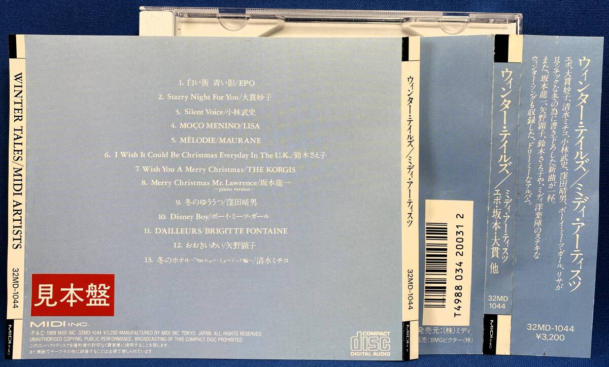 | ■タイトル:ウィンター・テイルズ WINTER TALES as told by MIDI ■アーティスト:V / A EPO 大貫妙子,小林武史,LISA,MAURANE,鈴木さえ子,THE KORGIS,坂本龍一,窪田春男,ボーイ・ミーツ・ガール,BRIGITTE FONTAINE,矢野顕子,清水ミチコ ■品番:32MD-1044 ■状態: ・中古、見本盤です。 ・盤面の状態:目立ったキズなく良好です。 ・ジャケット、帯、解説(インサート)に汚れ、擦れ、キズ等が多少ございます。 ※プラケースは、発売時のものから交換している場合があります。 ※撮影の仕方やモニターの状態により、実際と色が異なって見える場合もございます。 ※ご理解のある方のみご入札をお願い致します。 ※気になる点がありましたら、質問欄にてお問い合わせください。 ※この他にも多数出品しております。 ※複数落札の場合、同梱手配も承ります。 ↓下記バナー《Click here!マイ・オークション》をクリックしてご覧ください。 | ||
