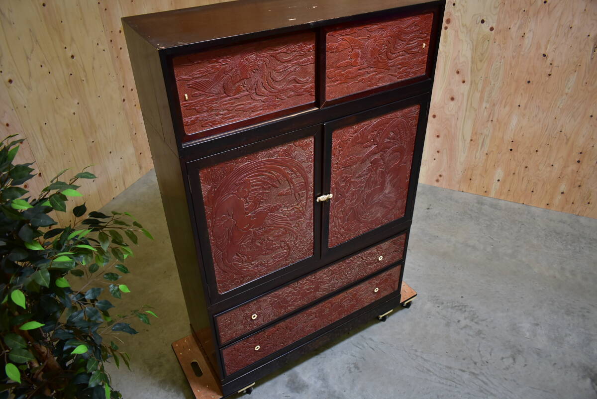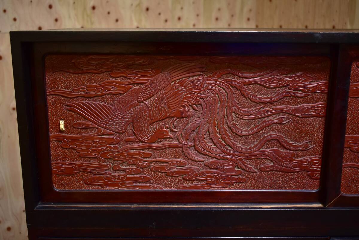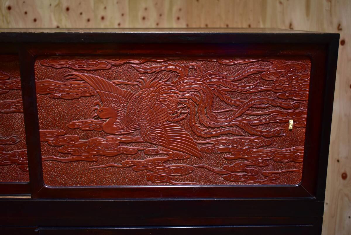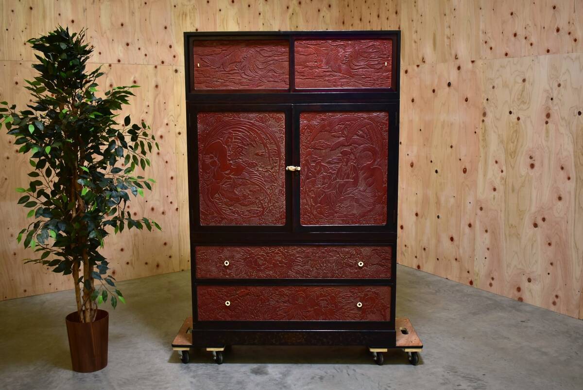 zyt2151ジ 中国美術? 着物箪笥 中開き 鳳凰/獅子/老人/梅/菊/牡丹/朱/彫刻/和箪笥/時代箪笥/幅115cm『仙台市 引取歓迎』70404-02 | |||