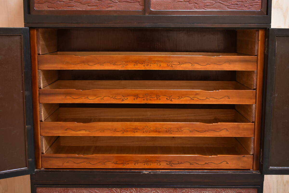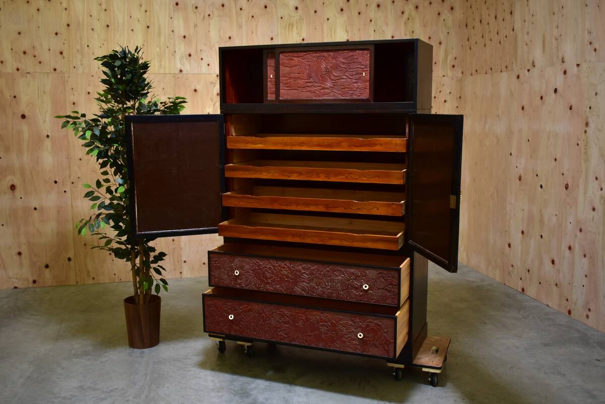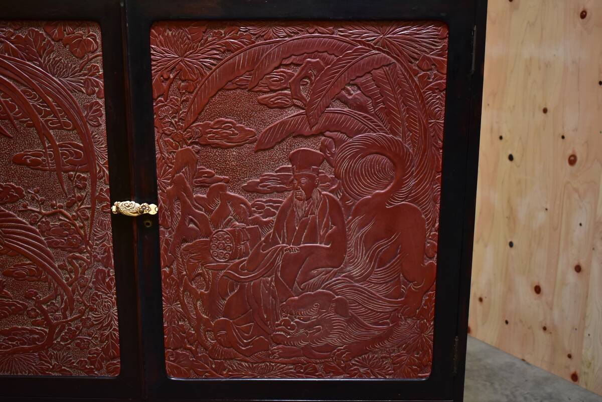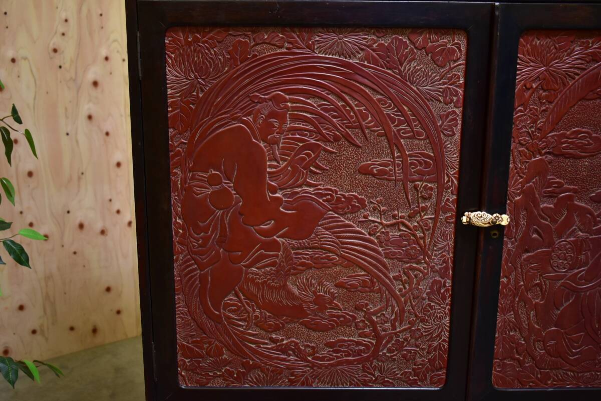 zyt2151ジ 中国美術? 着物箪笥 中開き 鳳凰/獅子/老人/梅/菊/牡丹/朱/彫刻/和箪笥/時代箪笥/幅115cm『仙台市 引取歓迎』70404-02 | |||