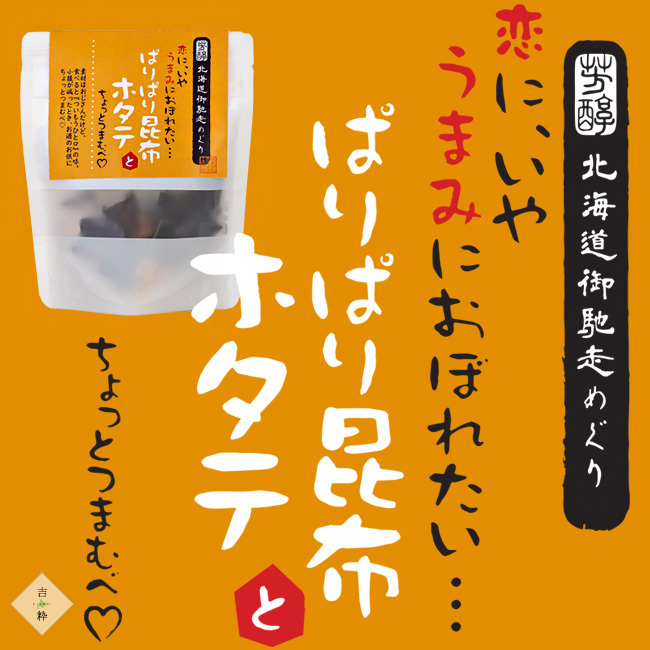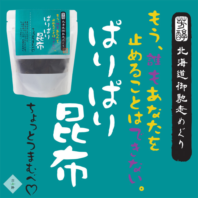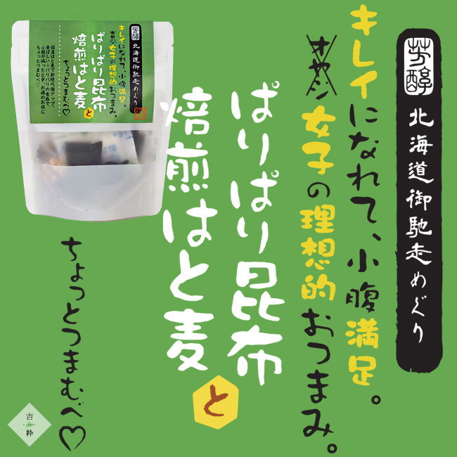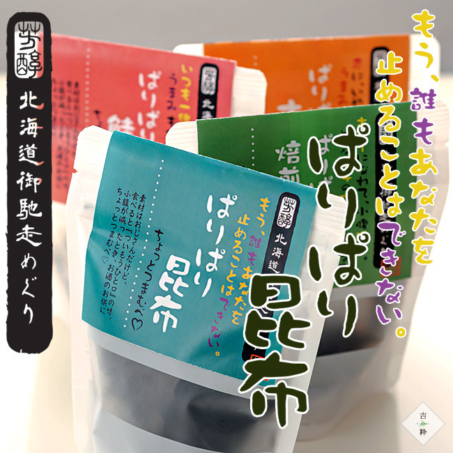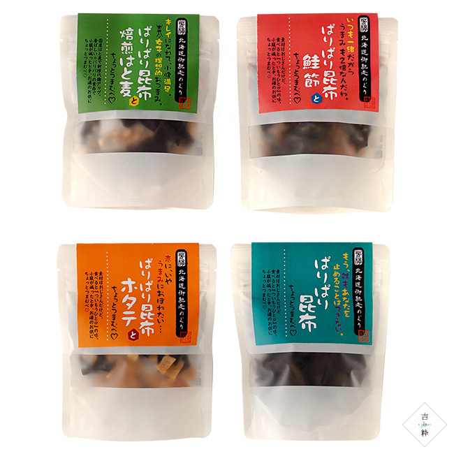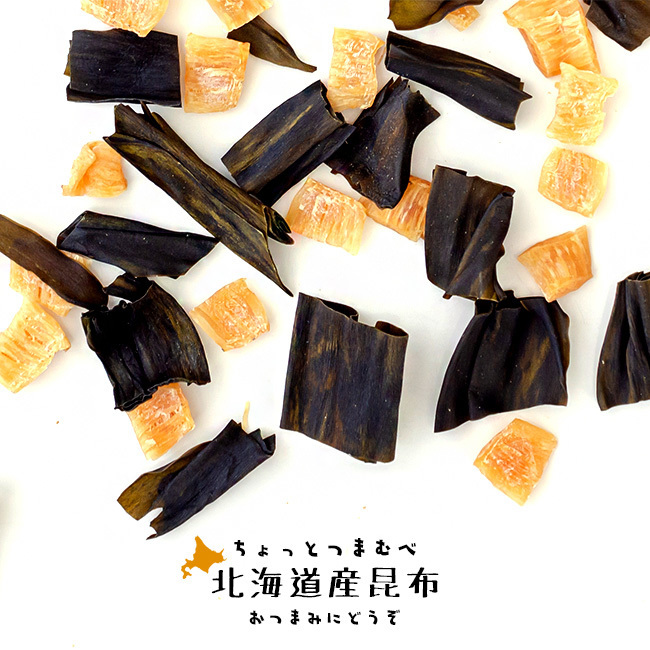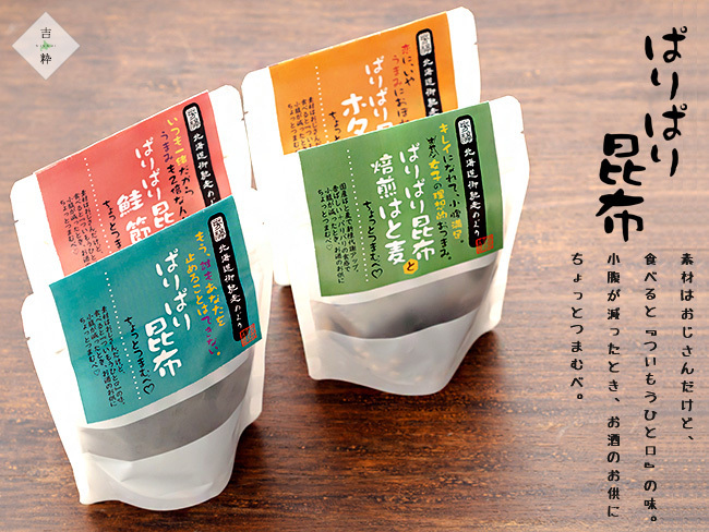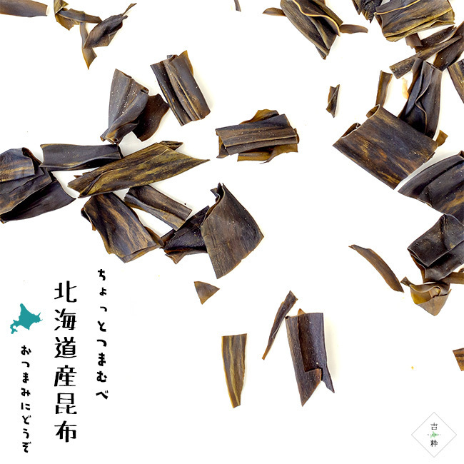 | 栄養成分表示 | ※推定値 昆布チップス(24gあたり) エネルギー:77kcal、たんぱく質:4.9g、脂質:0.0g、炭水化物:4.1g、食塩相当量:2.4g 昆布と帆立(17gあたり) エネルギー:53kcal、たんぱく質:5.8g、脂質:0.1g、炭水化物:7.5g、食塩相当量:1.5g 昆布と鮭節(16gあたり) エネルギー:52kcal、たんぱく質:5.6g、脂質:0.1g、炭水化物:7.1g、食塩相当量:1.0g 昆布と焙煎はと麦(20gあたり) エネルギー:66kcal、たんぱく質:3.8g、脂質:0.1g、炭水化物:12.4g、食塩相当量:1.5g |