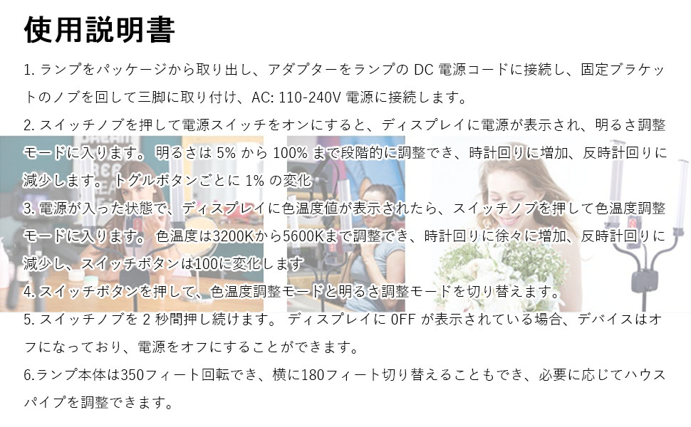 高品質のLED写真補助光、30wの出力電力、110v/220vの入力電力、3200k、4000k、5600kの色温度調整可能、4つの柔軟なアームを備え、180度の全方向照明感を体験できます。