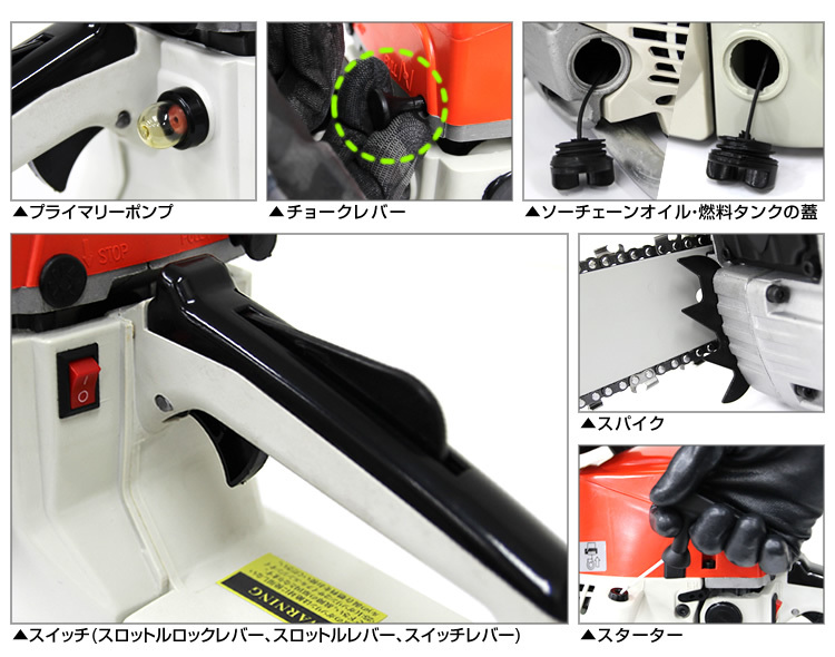 | \ プロ仕様の20インチ対応チェーンソー / 切れ味が良く太い木もシッカリと切断します。 電動式とは違い煩わしいコードは無く、重量は6.2kg程度なので持ち運びもストレスフリーです!! 薪作り、伐採作業まで幅広くお使い頂けます!お庭、公園、農地や果樹園などで活躍します! ガイドバーもソーチェーンも付属しているので、すぐに使用することができます。 ■商品コード:AA07E ■商品仕様 ・2ストローク 空冷式 ・排気量:51.2cc ・ガイドバーの長さ(約):50cm(20インチ) ・燃料:混合物(ガソリン:2 ストロークオイル25:1) ・燃料タンク容量:550ml ・オイルタンク容量:260ml ・キャブレター:バルブ式 ・潤滑システム:調節器が付く自動バルブ(本体潤滑) ・サイズ(約):幅87.5cm×奥行き25cm×高さ27cm ・重量(約):6.2kg ■内容 ・本体 ×1 ・ソーチェン ×1 ・ガイドバー20インチ ×1 ・ガイドバーカバー ×1 ・工具 ■注意事項 ・本商品を使用した際に発生したトラブル、事故につきまして、当社は一切の責任を負いかねます。 ・当商品は入荷の時期によりカラー、仕様などが変更される場合があります。ご了承下さい。(色指定はできません。) ■保障期間 7日間 ※商品到着後7日以内の初期不良・破損のみご対応させていただきます。 【新品未使用品です】 ▼検索ワード チェーンソー チェンソー エンジンチェンソー ガソリン 剪定 薪割り 伐採 エンジンチェーンソー チェーンソー エンジン 軽量 のこぎり 万能のこぎり |