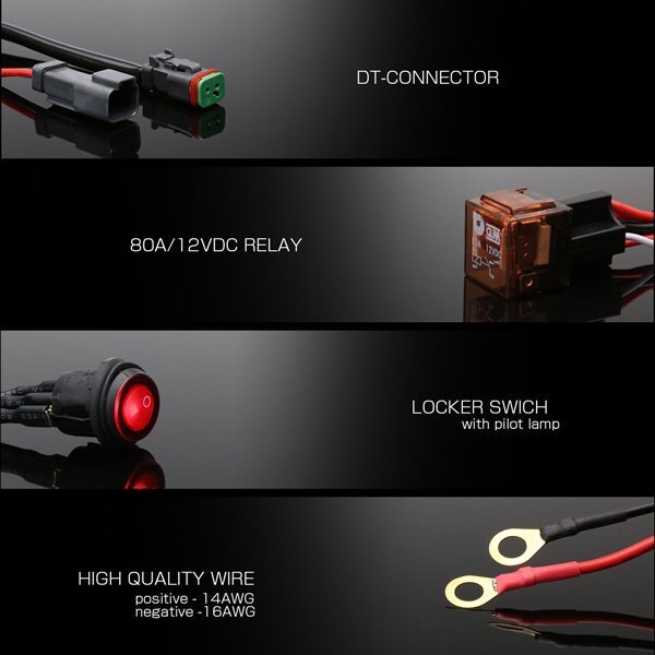 ワークライトやライトバー、フォグライトの取り付けに適したスイッチ付きリレーハーネスキット。 防水性、防塵性に優れたDTコネクタを採用。 互換性も高くメーカーによってはカプラーオンでの接続も可能です。 接続用ハーネスも付属していますのでお持ちのライトを容易に取り付けできます。 | ■ DTコネクタシリーズ リレーハーネス No.I-445 ■ 動作電圧:DC12V ■ 300W MAX ■ パイロット付き 防滴ロッカススイッチ ■ ランプ2個用 ■ 全長:約3.0m 他、DTシリーズ ハーネスは⇒ こちら その他、ワークライト関連は⇒ こちら | |