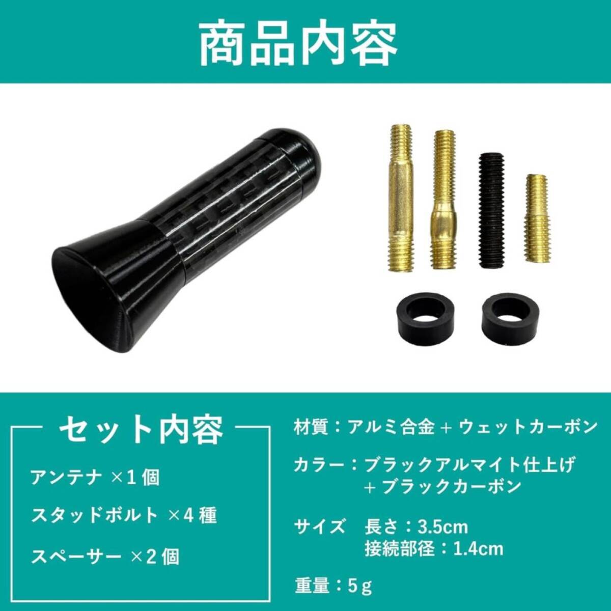| セット内容 | ●カーボンアンテナ本体×1 ●ネジアダプター(5mm/6mm) ・本体ネジの根本外径は約14mm ●スペーサー×2個(高さ約5mm,内径約10mm*ゴム製/カット可能) ・アンテナと台座に隙間が空く場合に使用します ・車の個体差や元々のサイズなどにより、付属のスペーサーが 取付け出来ない場合や取付け不要の場合もございます |