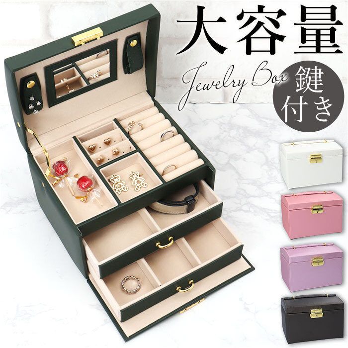 | 商品説明 | ・・お気に入りのアクセサリーをまとめて収納♪鍵付き大容量ジュエリーボックスが新登場。 ・【見やすくたっぷり収納できる3段式!】 ・なくしがちなアクセサリーをまとめて整理整頓◎上段と下段合わせて3段の収納が付いており分けて収納できるのがポイント。 ・【上段】 ・よく使うアクセサリーの収納に便利!リングスロット×8とピアス穴×16、大小1ずつのトレー付き。 ・大のトレーは縦に長く、腕時計の収納に便利◎ ・【鏡付き】 ・天面裏の中央には鏡が付いており、ピアスやネックレスの着脱時もスムーズに。 ・【下段】 ・・2つの引き出しが付いており、上の引き出しにはブレスレットやバングル、下の引き出しにはブローチや大きな石が付いたリングの収納にピッタリ♪ ・【仕切りの取り外しが可能】 ・上段のピアス穴付き仕切りと、下の引き出しの仕切りは取り外しが可能。収納するアクセサリーに合わせてカスタマイズが可能。 ・【傷付きを防止】 ・内張りと仕切りはベロア調の生地を使用し、アクセサリーを優しく保護。 ・【ワンタッチ開閉】 ・開口金具の両サイドを内側に押してオープン!戻す時は、カチッと鳴るまでフタを閉じるだけ。 ・【鍵付きで安心】 ・大切なアクセサリーを保管するのに最適◎ ・【出しっぱなしでもOK】 ・程よい光沢感とゴールドパーツが上品な仕上がり♪インテリアに溶け込み、出しっぱなしでもOK。 |