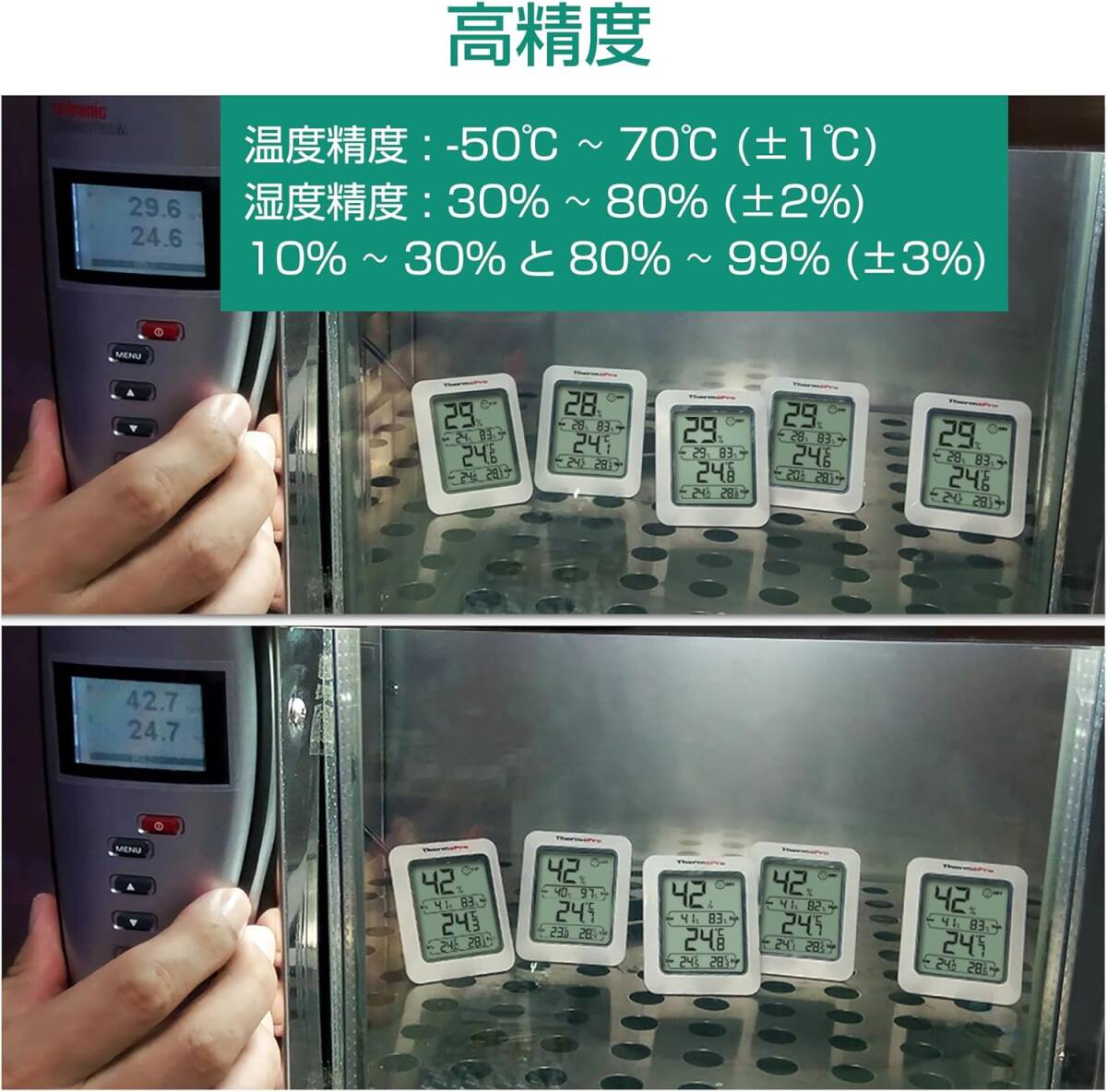メリット ①一目瞭然 ②最高最低温湿度記録(全期間) ①時計付き ②最高最低温湿度記録(24時間) ①コンパクト、便利 ②一目瞭然 ①タッチスクリーン ②バックライト ③温湿度傾向矢印 ④最高最低温湿度記録(全期間・24時間) ⑤低電池残量表示 ①バックライト ②温湿度傾向矢印 ③最高最低温湿度記録(全期間・24時間) ④低電池残量表示 ①バックライト ②温湿度傾向矢印 ③最高最低温湿度記録(全期間・24時間) ④子機センサー付き ⑤低電池残量表示 快適レベル表示 顔マーク表示 顔マーク表示 文字表示 文字表示 温度測定範囲 -50°C~70°C -20℃~70℃ -50°C~70°C -50°C~70°C -50°C~70°C 親機 -20℃~70℃ 子機 -50℃~70℃ 湿度測定範囲 10%~99% 10%~99% 10%~99% 10%~99% 10%~99% 親機 10%~99%(子機が湿度測定できません) 製品サイズ 8x7x2.2 cm 8.2x9.85x1.9 cm 5.6x5.3x1.8 cm 8.5x11x2.4 cm 7x8.5x2.3cm 親機 8.4x6.6x2.3 cm 子機 6.3x7.4x2 cm Thermopro温湿度計は高精度の温湿度センサーを搭載しており、高精度で信頼性の高い温湿度測定を実現し、より正確な温度や湿度を管理できます。 梱包内容 1 x 温湿度計 1 x単四型電池 1 x 日本語説明書 ThermoPro TP50 温度計・湿度計 ThermoPro デジタル温度計・湿度計は家庭用計器としては極めて高いクオリティで温度や湿度をしっかりと教えてくれます。デザインは至ってシンプルなので、リビングや書斎、ベッドルームに玄関先などシーンもインテリアも選ばず置いて頂けます。 温度範囲:-50°C ~ 70°C 温度精度:±1°C 湿度範囲: 10% ~ 99% 湿度精度: 30%~80%: ±2%, その以外: ±3% 過去すべての時間の最高&最低温湿度値が記録されています。 測定間隔: 10 秒間 顔マークでお知らせ:乾燥、快適、不快 顔の表情でお知らせ 1、お肌への潤い環境チェック お肌のコンディションは、季節の変わり目や生活環境の影響を大きく受けています。 2、赤ちゃんの健康管理 子供にとっては、少しの温度・湿度変化も大変なので、こういった機器は必要だと思います。 3、熱中・カビ対策 湿度が高い梅雨時、夏場は細菌やカビの繁殖に、そして寒く乾燥する冬場にはインフルエンザウイルスなどの病原菌への対策として室内の温度、湿度を把握することはとても良いことです。 4、インフルエンザ予防対策 空気の乾燥はインフルエンザの原因の一つとなる可能性があります。 マグネット付き・置き式・二つのタイプ 冷蔵庫に貼りつけたり、本棚にスタンド置きなど、自由な置き方ができるので、人間だけでなく、ペットや観葉植物の環境管理にも便利です。 お知らせ: 現在、2種類のタイプが倉庫にあります。性能は同じです。以下のタイプが受け取る可能性があります。 タイプ1:上ー温度が表示されます。 下ー湿度が表示されます。 タイプ2:上ー湿度が表示されます。 下ー温度が表示されます。 測定速い&高精度 10秒ごとにデータを更新し、感度と精度両方とも優れています。温度と湿度の精度はそれぞれ ±1°C と ±2~3%RHです。 【CLEARボタン】:タッチパネル3秒間を押し続けて、過去のすべて最高・最低湿度と温度の記録をリセットがされます。