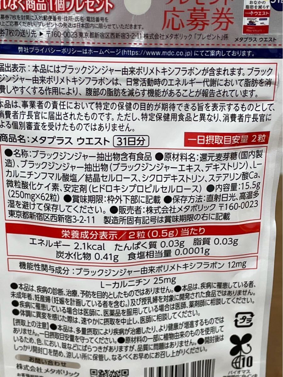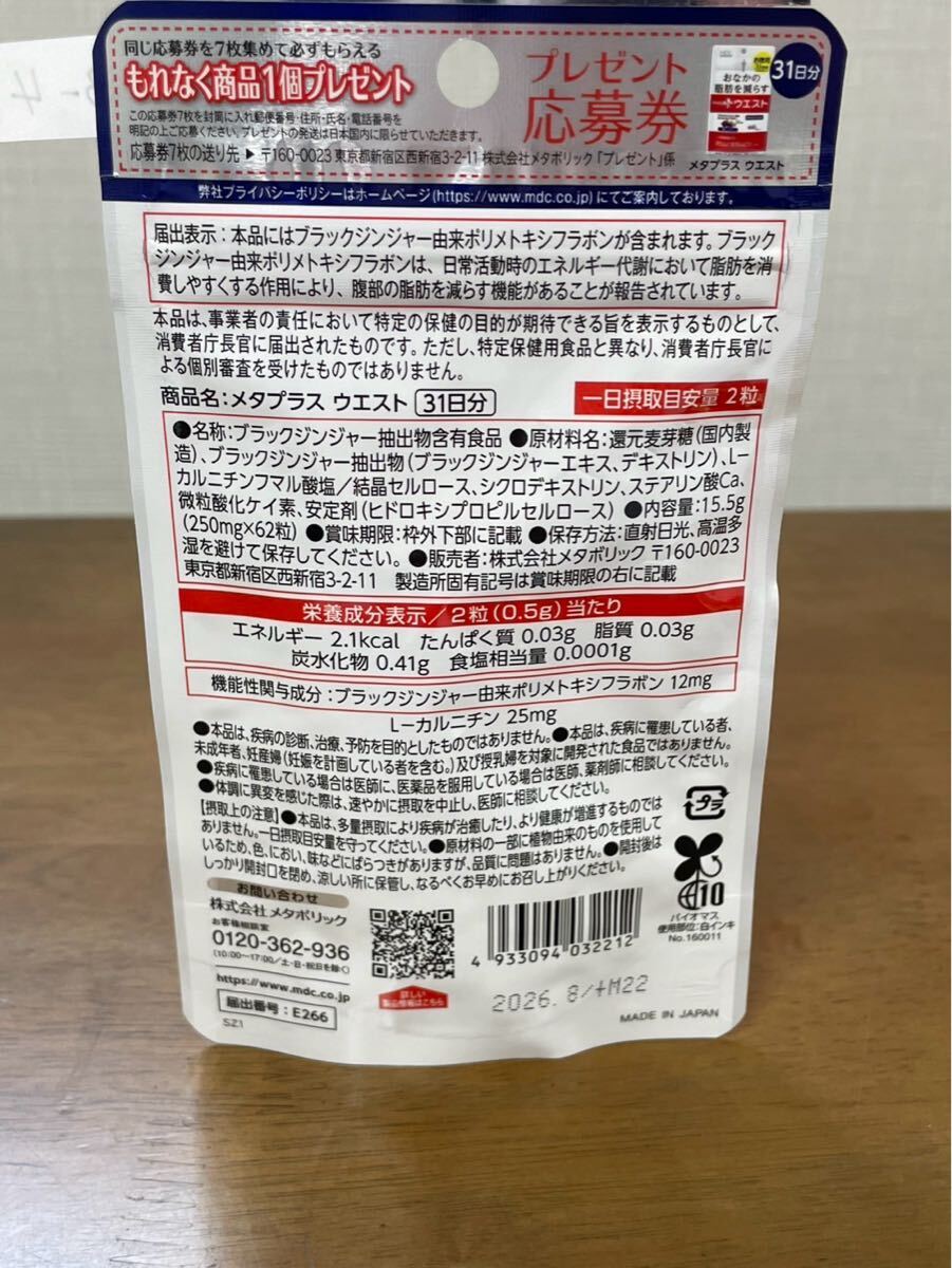 メタプラス ウエスト 31日分 62粒 機能性表示食品 2026.8期限 ★ 13-1〜4| 出价者 | 信用 | 价格 | 时间 |