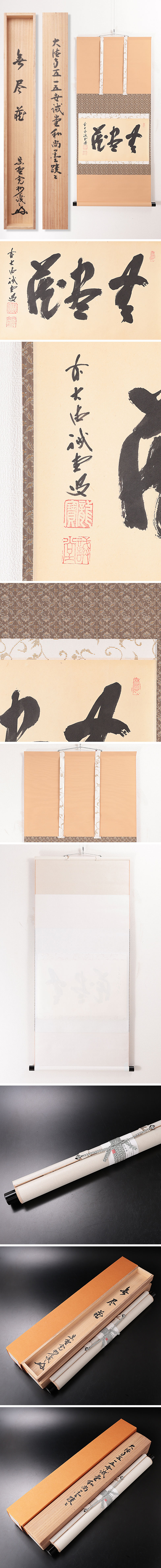 流麗かつ豪快な筆致で書かれた素晴らしい書です。 【無尽蔵(むじんぞう)】・・・(有用なものが)幾ら取っても尽きないほど、豊富にあること。 ★商品は藤井誡堂自筆、長谷川寛州識の作品である事を保証致します。 ※掛軸の同梱発送について※ 掛軸とお茶碗などの茶道具との同梱は、破損の危険性が非常に高いため、基本的に承っておりません。予めご了承下さいますようお願い申し上げます。掛軸同士やその他形状が近い商品に関しては同梱可能な場合もございますので、その際は当店よりお知らせ致します。 |