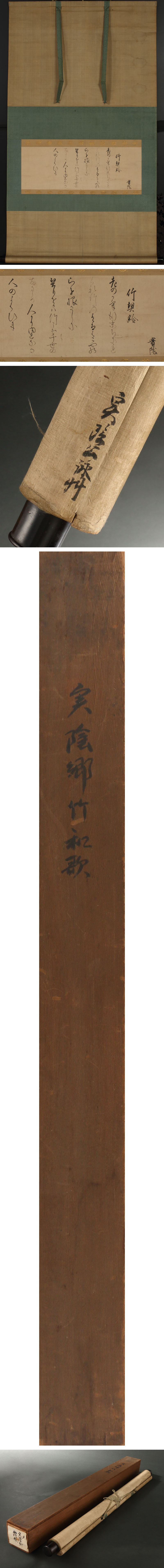 武者小路実陰の和歌詠草です。 「竹契齢」と題し、「老のゝち行末契れくれたけの よゝははこやの山をねさしに」「契りをかは竹こそ千世の友ならめ 人にまれなる人のよはひに」の二首を詠んでおります。『新続題林和歌集』および『列聖全集』の記述より、元禄4(1691)年12月14日、儀同三司園基福の七十賀を祝す和歌御会で詠まれたものと見られます。実陰31歳の書です。 園基福は霊元天皇の外伯父であり、本御会は関白近衛基熙・有栖川宮幸仁親王などの出詠があったことが確認されます。しかし時しも東山天皇の親政を企図する基熙ら朝廷執行部と仙洞霊元院の権力闘争の只中であり、院政を布こうとした霊元院の発言力が表舞台より排除されつつあった時期の作であることも知られます。実陰の和歌は「はこやの山(仙洞)」や「世にもまれなる人のよはひ(古稀)」を詠み込んだものであり、霊元院への政治的シンパが感ぜられます。 実陰中年期の書様を伝える、見事な逸品です。 ◆武者小路実陰 江戸前・中期の公卿・歌人。武者小路公種の養子。元禄8(1695)年従三位。霊元上皇より古今伝授をうけ、中御門・桜町天皇2代の和歌師範となった。霊元院歌壇の代表的歌人で、弟子に似雲らがいる。元文3(1738)年従一位、准大臣にすすみ,同年没。78歳。歌論集に「初学考鑑」、家集に「芳雲集」。 付属:識箱が付属します。 寸法:高さ103cm、幅60cm(最大幅。若干の誤差はご了承下さい) 状態:経年のイタミがございます。 |