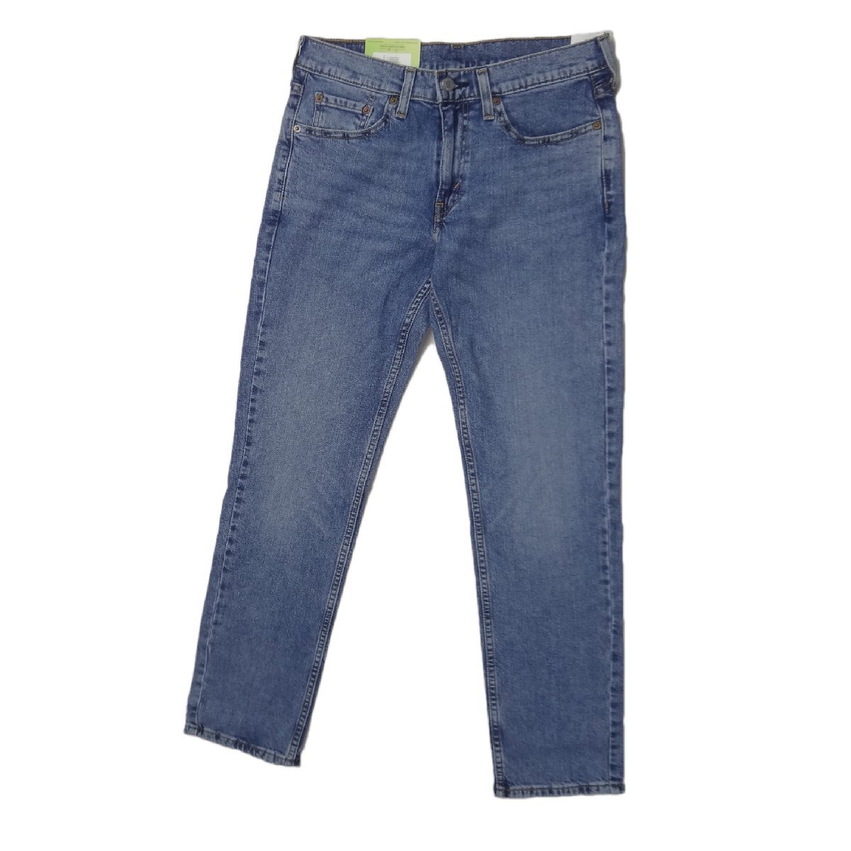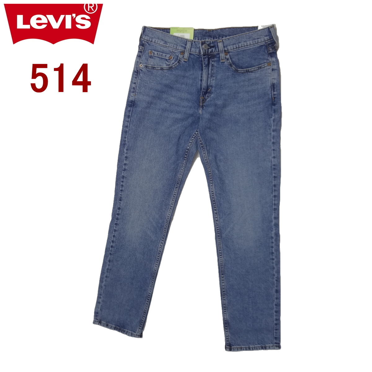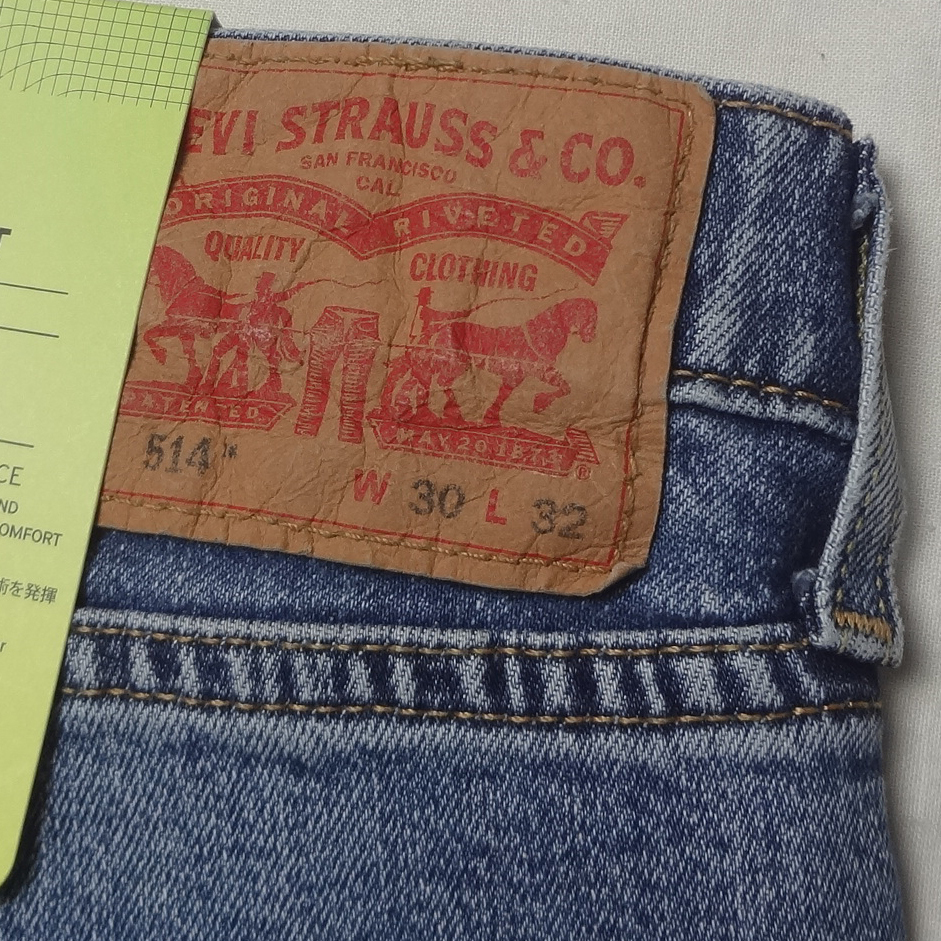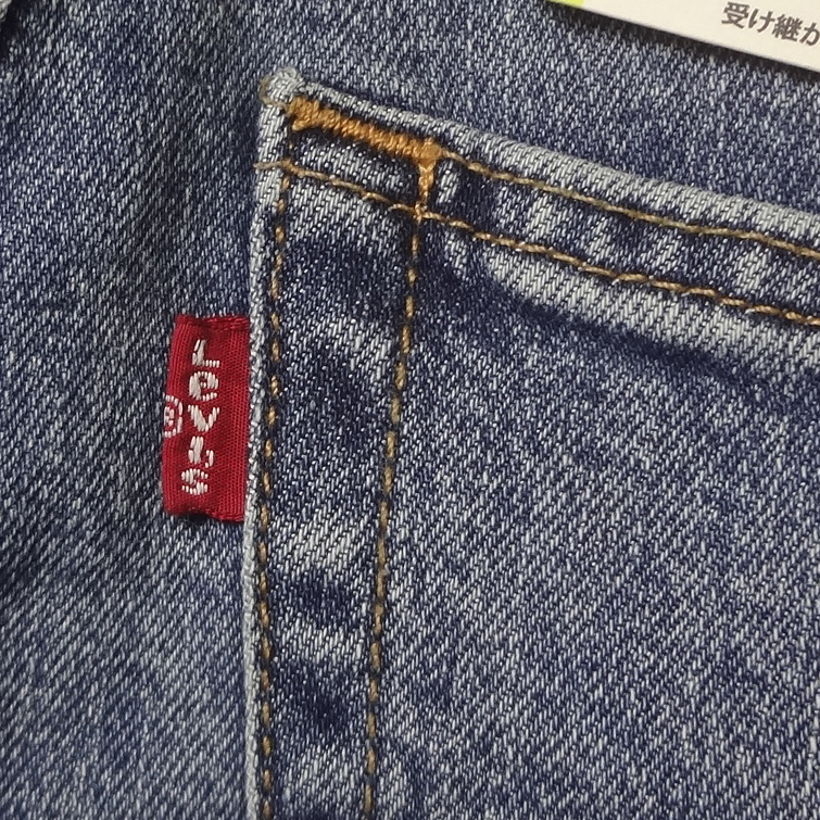 リーバイスの514ストレートジーンズ、ストレッチブルーデニム綿70%/リヨセル28%/ポリウレタン2%、股下77cmに裾上げされています