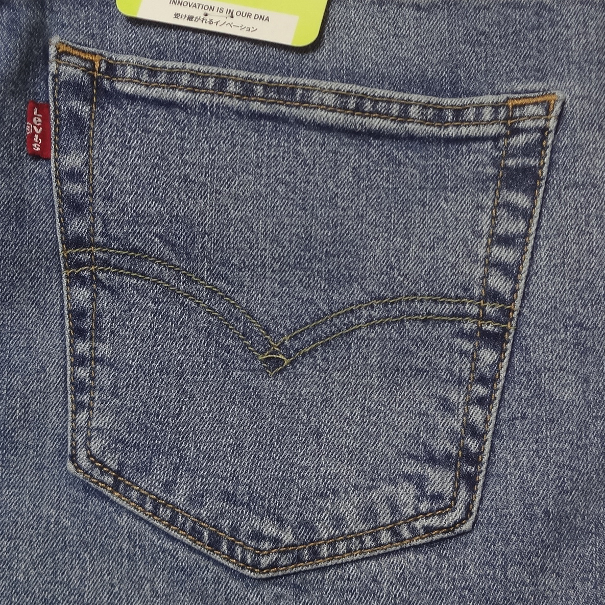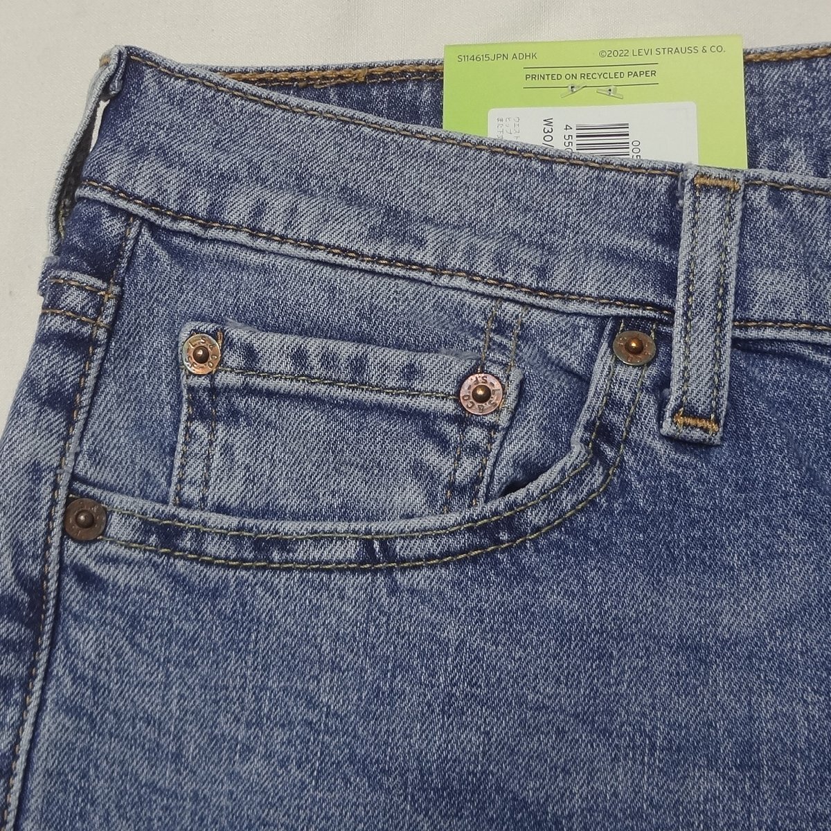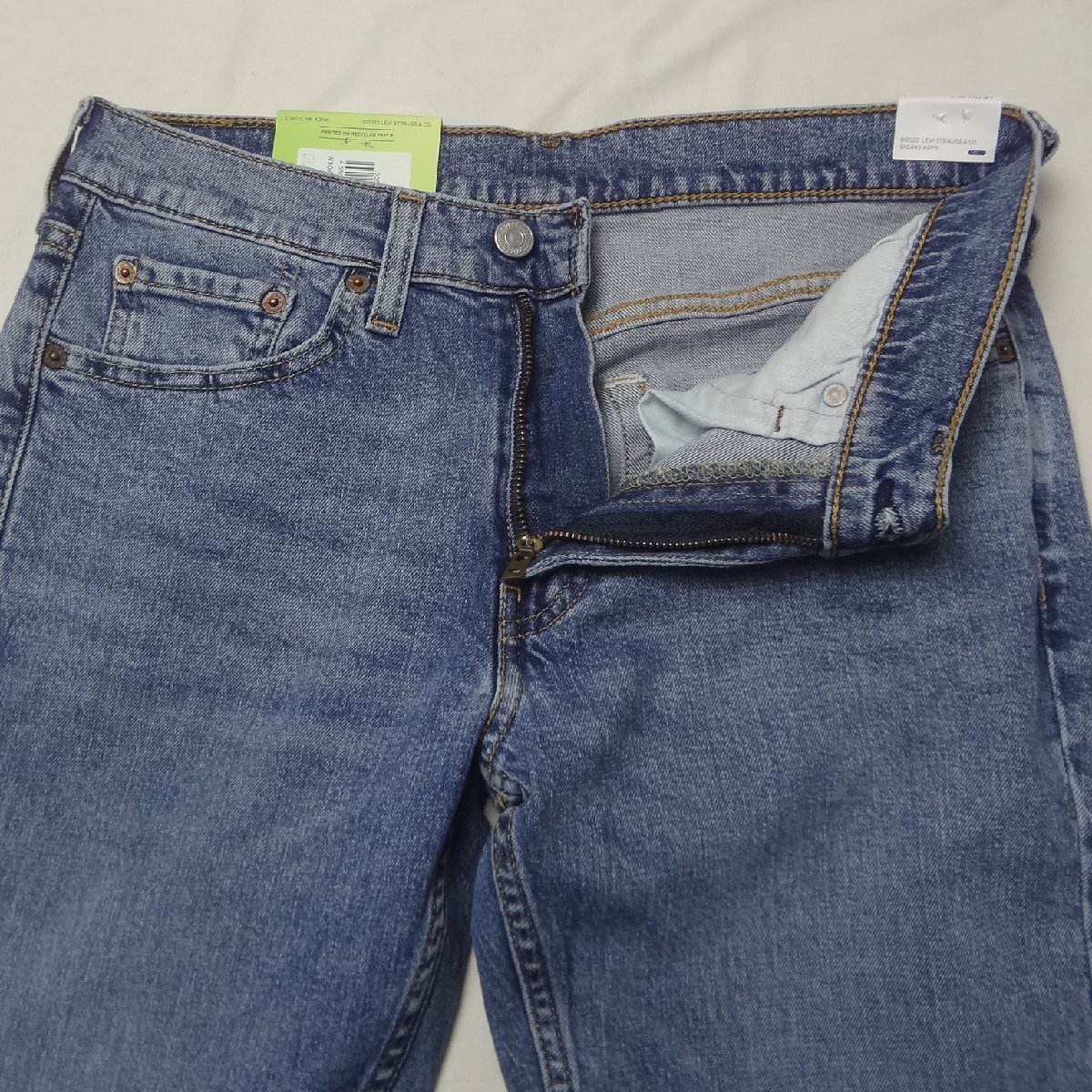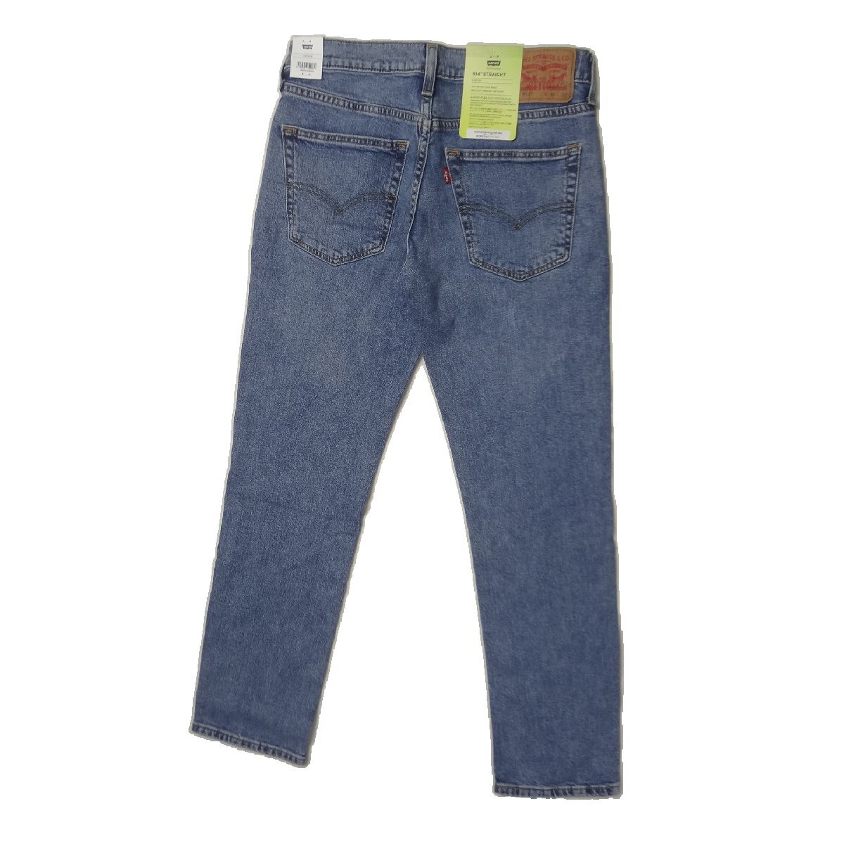 リーバイスの514ストレートジーンズ、ストレッチブルーデニム綿70%/リヨセル28%/ポリウレタン2%、股下77cmに裾上げされています