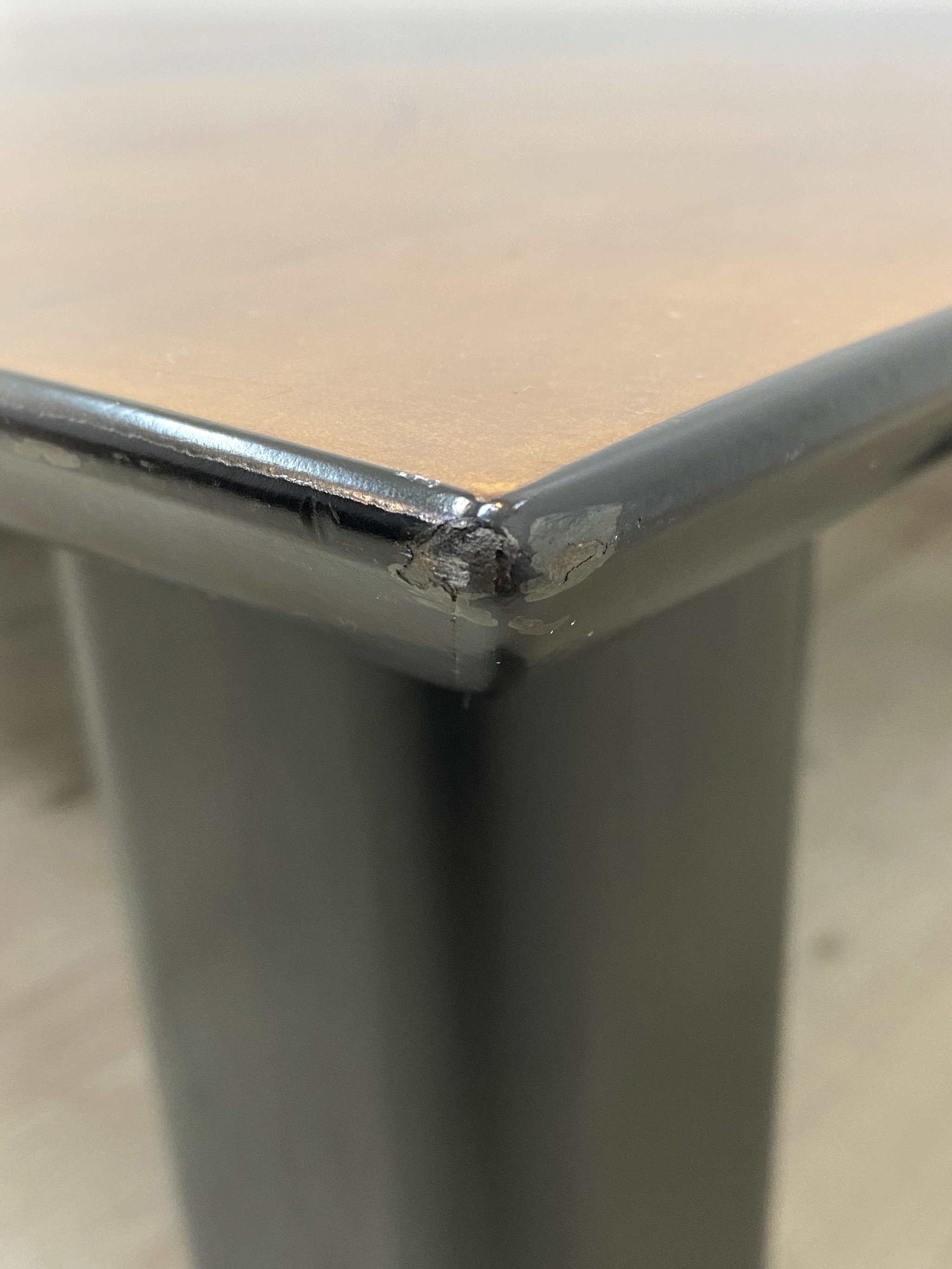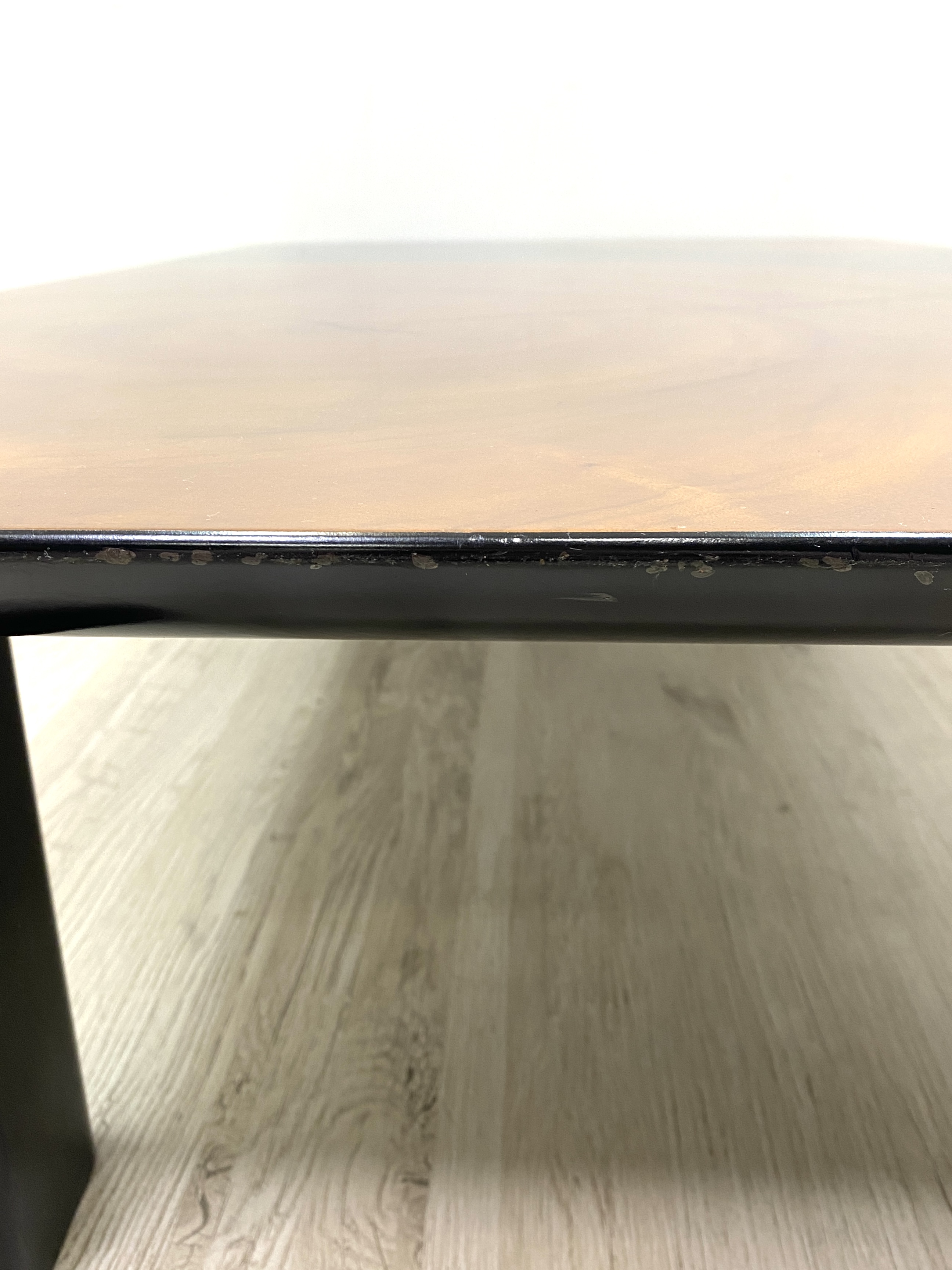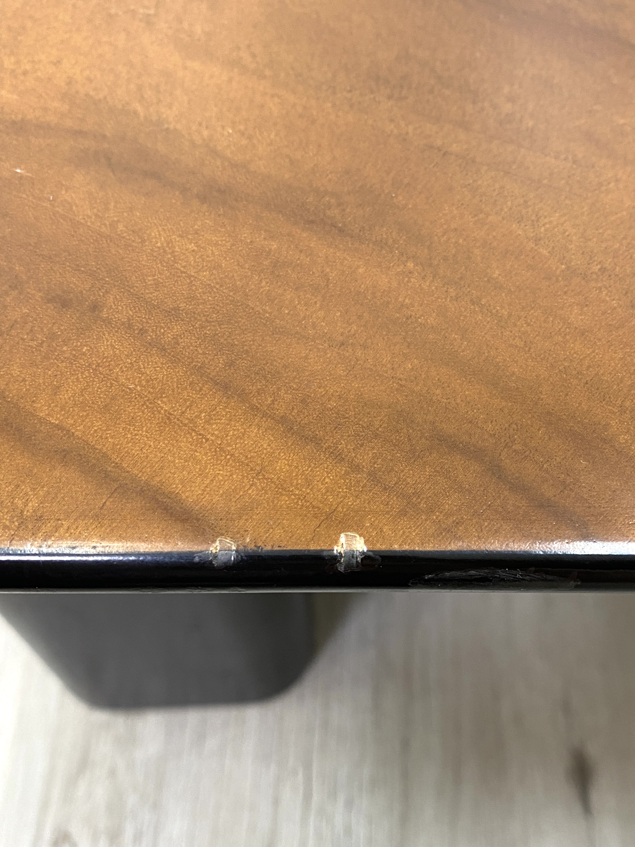 こちらは松岡漆工の座卓です。 中古品です。 【松岡漆工】 昭和21年に福岡県大川市で創業した老舗家具メーカーです。 「和モダン」をコンセプトに、現代的なデザインの和家具を職人が一点ずつ受注生産していました。 モダンなデザインと漆を用いた伝統的な技法を組み合わせた製品が特徴です。 和モダンを得意とする福岡のメーカー、松岡漆工の座卓です。 天板に希少な大楠の巨木丸太をあしらった、和モダンスタイルの一品。 均整の取れた美しいフォルムと、美しい年輪が唯一無二の魅力的な表情を醸し出しています。 天板に使われているリボンのようなパーツは、鎹(かすがい)と呼ばれるものです。 鎹(かすがい)は、板の剥がれや割れを抑える硬い木でできたパーツのことで、 無垢天板の加工や意匠として用いられています。 漆黒との組み合わせが普通の座卓とは一味違った、高級感を味わえる逸品です。 松岡漆工は2015年に終了しているため、現在では手に入れることの出来ない希少なお品です。 【コンディションについて】 天板や脚など全体に薄いキズがあります。天板の縁は所々小さく欠けています。 使用感はありますが、しっかりとしたつくりで長くご愛用いただけるお品です。 和モダンテイストの空間づくりにおすすめしたい一台です。 他詳細については下記画像も併せてご参照ください。