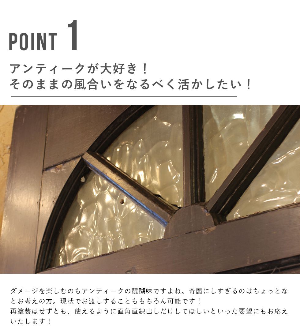 イギリス、フランスを中心にヨーロッパ中から直接買い付けをした本場のアンティーク品となります。 高級なイメージのアンティークですが、当店ではリーズナブルにアンティークをお楽しみい頂けるよう、ステンドグラスは一度に1,000枚以上。アンティークドアも100枚以上を一度に輸入。 全国でも有数の買い付け量を誇ります。 創業以来現在の買い付け量を保つ事で、現地ディーラーとの密な信頼関係を構築。当社に向けてより良い物を提供してもらえる環境作りを維持し、現在では現地取引先約20社と提携しています。 また当店ではアンティークのプロフェッショナルが常駐する工房を完備。修理、メンテナンスはもちろん、ステンドグラス、ドアの制作からカスタムまで、アンティークのご相談はウェリントンにお任せください。 ネットに載っていない商品もまだまだございます。京都伏見のショールームにも是非お越しくださいませ。 ※修理に関するご注意※ ■ 標準修理に関しては別途料金にて承ります。事前に仕上がりサイズを必ずご確認くださいませ。 ■ 標準修理をご依頼の場合、決済確認後の着手となります。恐れ入りますが代引きでのご決済はお断りしております。 |