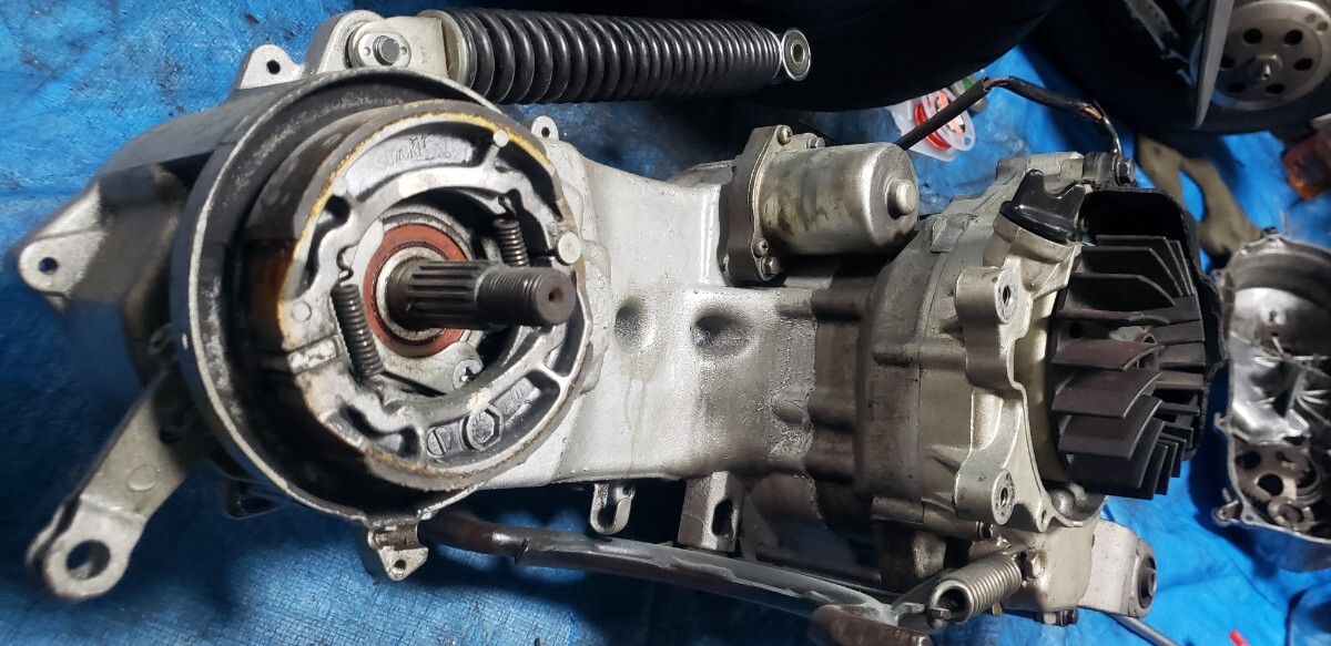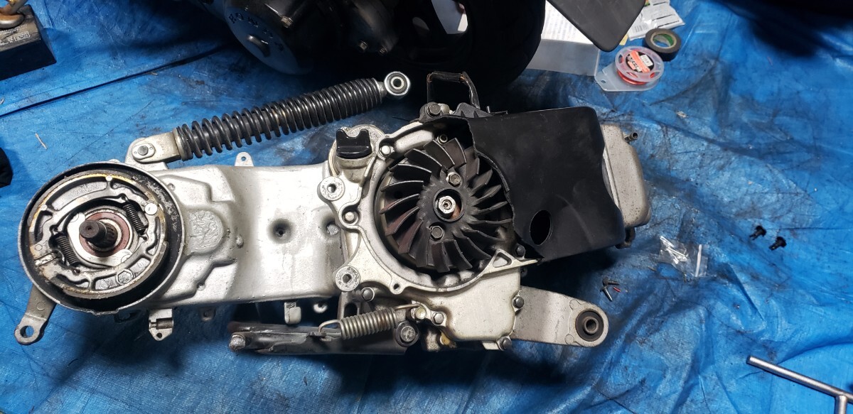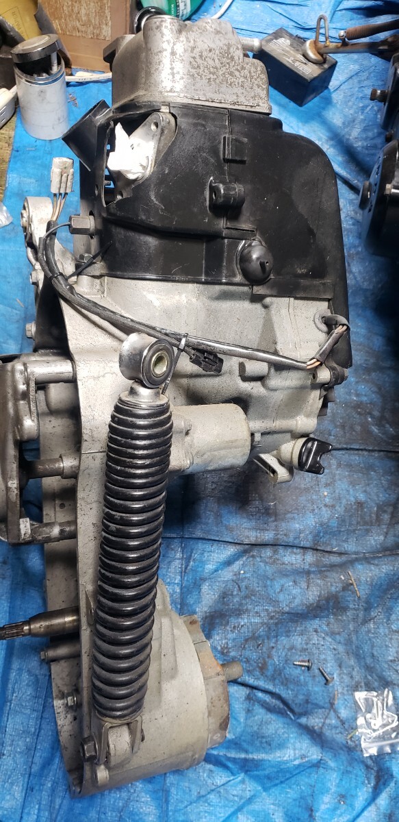 レッツ4のエンジンです。ピストン、シリンダーのボルト、ヘッドカバーのパッキンを別のエンジンに使った残りです。シリンダーに微妙なキズがありました。プラスチックのカバーに割れあります。それ以外は良い状態だと思います。送料着払いにてヤマトから発送致します。