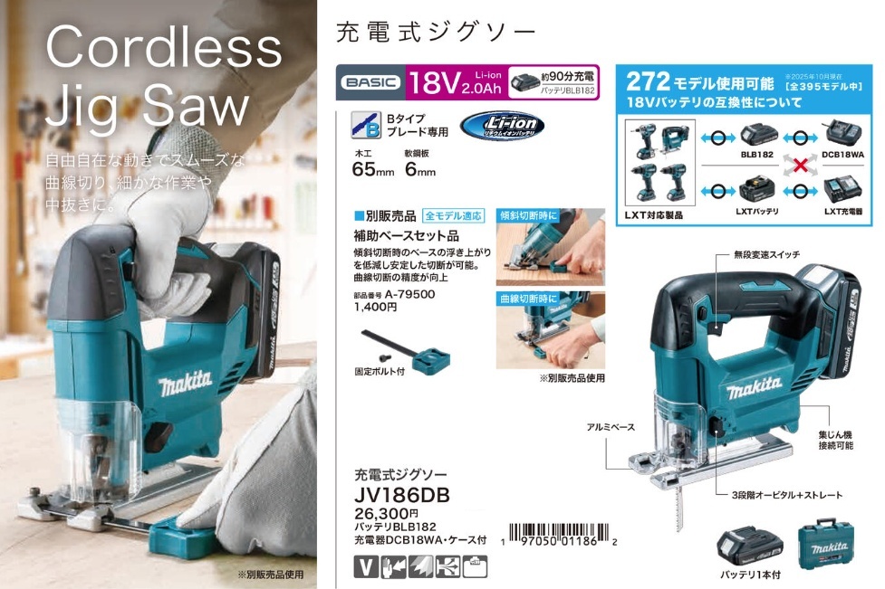 マキタ makita充電式ジグソーJV186DBバッテリBLB182+充電器DCB18WA+ケース付 197050011862■無段変速スイッチ■アルミベース■3段階オービタル+ストレート■集じん機接続可能※別販売品のリチウムイオンバッテリBL1860B(0088381464031)使用可能です。
