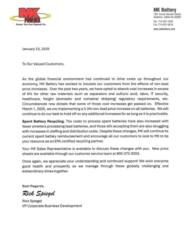 2025年3月生産以後、アメリカ本社から価格改正の連絡が有りました