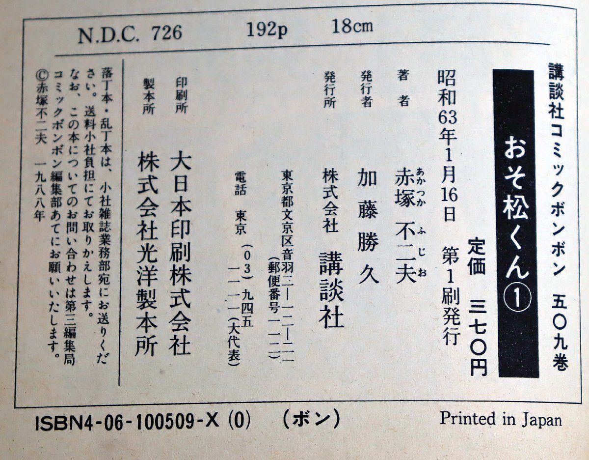 | P◇中古品◇書籍/漫画 『おそ松くん 第1巻』 講談社 初版 著者:赤塚不二夫 コミックボンボン 発売:昭和63年(1988年) ※変色があります※ | |