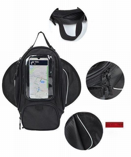 "サイズ:約32x18x13cm マグネットで固定、取り付け、取り外しとても便利です。 スマホタッチパネル操作可能です、透明なスマホポケット付き、スマートフォンから地図を見ることができます。 ショルダーベルト一本付き、ショルダーバッグとして使えます。 大容量、お金、カード、スマホ、地図などの荷物を収納できます。"