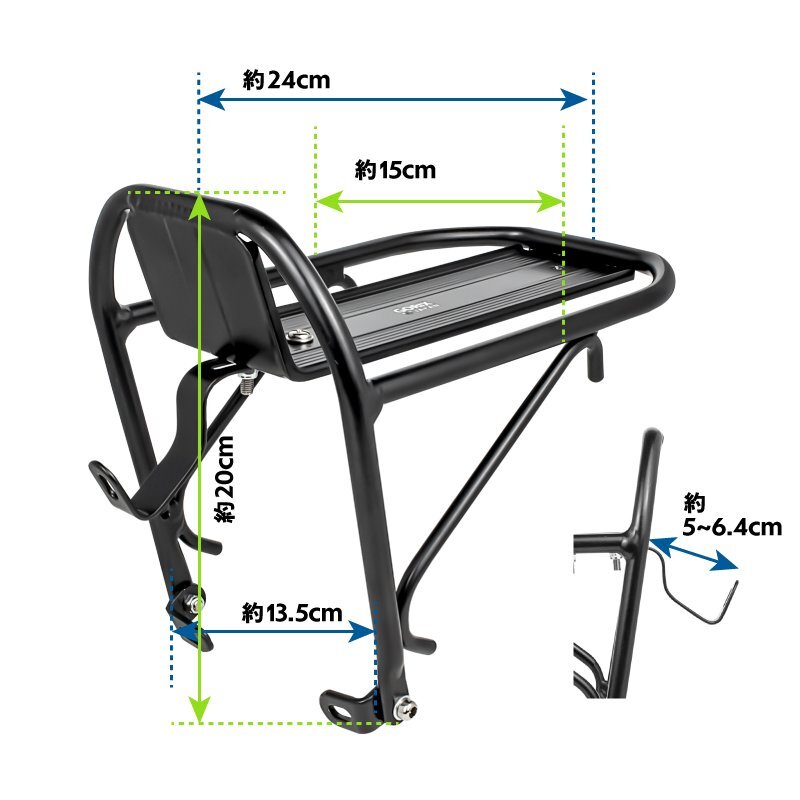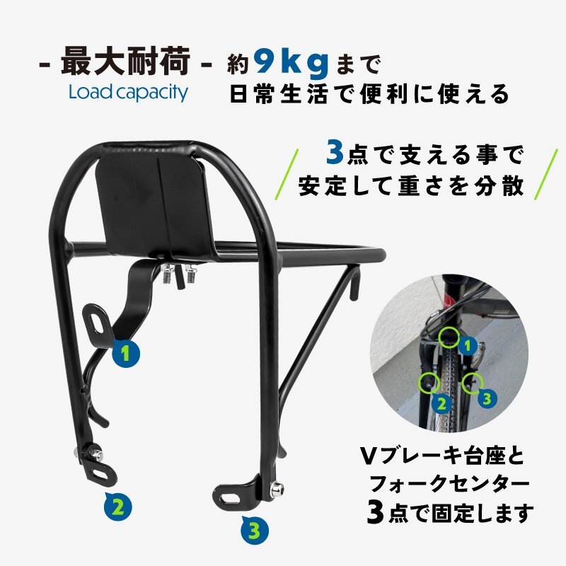 スポーツ自転車でのツーリングやお買物が多い街乗りにぴったりのフロントキャリア。 荷物を背負わずラックに載せて、日常のお買物が便利! Vブレーキ台座とフォークセンターの3点に固定します。 自転車通勤などの普段使いからツーリングまで。取付けも簡単でスムーズに作業を行えます。 ゴムバンドやタイラップで荷物をフロントラックに固定してお使い下さい。 Vブレーキ装着の24-28インチ自転車に対応(クロスバイクやMTB、ミニベロなど) [軽量で丈夫] アルミ合金素材は軽量で強度が高く耐食性に優れています。 アクティブなサイクリングに最適な素材です。 またアルマイト塗装で通常の塗装に比べさらに軽量性で耐久性に優れる。 プレート部分はサビに強く、泥除けにもなるので、雨の日も安心です。 [最大耐荷] 最大耐荷重は9kgまで可能。 3点で支える事で安定し、重さを分散します。 [簡単取付け] Vブレーキ台座とフォークセンターの3点に固定します。 [対応自転車タイプ] Vブレーキ、24-28インチの自転車に対応。 (※車種によっては取り付けできない場合があります。) クロスバイクやMTBなど。 ※ご購入前に装着に必要な部分のご確認お願いします。 商品内容フロントキャリア、日本語説明書 荷台サイズ長さ24×幅15cm、高さ最大20cm 材質アルミニウム合金 最大耐荷約9kg 対応自転車タイプVブレーキ、24-28インチの自転車に対応 (※車種によっては取り付けできない場合があります。) 《ご注意》 ・商品は入荷によりキズがある場合があります。 ・傷や細かい汚れが気になる方や神経質な方はご購入をご遠慮ください。 ・ディスプレイ環境により実物と色が異なる場合や、入荷時期により予告無く一部仕様変更する場合がございます。 |