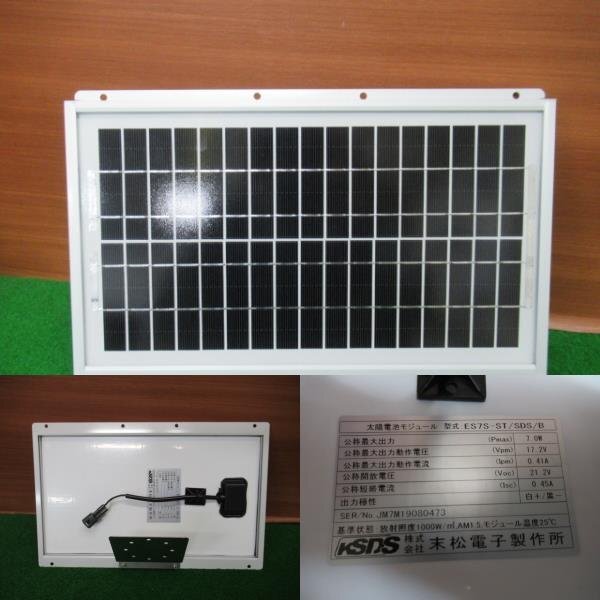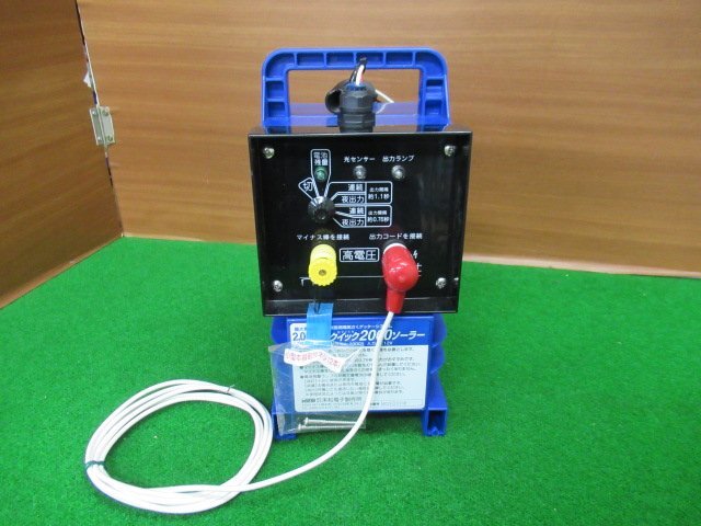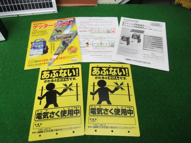 電気柵 【メーカー】 末松電子 【型式】 クイック2000ソーラーセット 【仕様】 ・電源(V)DC12 ・消費電力(W)0.416(最大:0.57)、(エコ回路作動時:0.035/最大0.049) ・出力電圧(V)約9500 ・電線長さ(m)最大:2000 ・重量:5.0kg [ソーラーパネル寸法(縦×横×奥行)(mm)] ・ソーラーパネル正面・背面取付:435×330×220 ・ソーラーパネル側面取付:435×165×330 [機能] ・出力間隔:約1.1秒/イノシシ・シカ等、 ・出力間隔:約0.76秒/サル・小動物等、連続24時間作動、 ・夜出力:夜のみ作動(光センサーで明るさを感知) [対象動物] ・イノシシ・シカ・サル・小動物 等 【付属品】 ミニゲッターパックS 出力コード2.5m バッテリーコード マイナス棒30型(アース棒30型) 注意表示板(2枚) 取扱説明書 未使用品になります。 ※初期不良の場合商品到着後7日間は返品対応致します。 ※実作業による長時間の確認は行っておりません。 未使用品になりますが撮影及び中身確認の為開封させていただいておりますのでご了承ください。 画像の物が全てになります。 他に付属品等はございません。 上記の事をご理解・ご了承の上で ご入札をお願い致します。 その他ご不明な点等ございましたら、ご入札前にお気軽にご質問下さい。 ※17時以降にお問い合わせ頂いたご質問等につきましては、お応えするのが翌営業時間中になりますのでご了承ください。 ※オークション終了日当日のご質問は、17時迄にお願い致します。 *詳細につきまして ご質問されましても お答えできない場合もございます。 | ||||