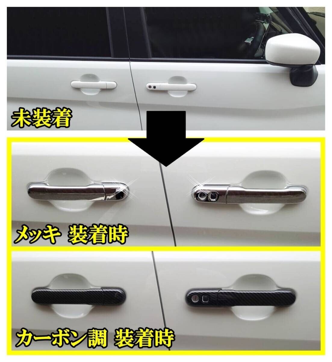 | 商品説明 | ご覧頂き誠にありがとうございます。 【発送方法】 日本郵便レターパックプラス(全国送料無料です。) ご入金確認後1-2日以内に奈良県から発送いたします。 【カラー】 メッキ ドアハンドルに貼るだけでお手軽にご使用いただけます。 両面テープで強力接着。 覆うタイプのカバーですが、 指タッチでの解錠 施錠用の穴がありますので操作に影響が出ません。 【内容/材質】 ABS樹脂 【個数】 1台分(写真に写る9ピース) 穴がない小ピースが1個だけですのでご注意ください。 【備考】 輸入品のため、わずかなスレなどがある場合がございます。できる限り綺麗な状態にしてお届けさせていただくため、1つ1つを当店にて検品/研磨させていただいております。 装着時、1mm以下でのフィッティング誤差がある場合がございますので 細部まで完璧なフィッティング性ではないことをご了承のほどお願い申し上げます。 (使用上の問題がなく パッと見ても気づかない程度です。) 【適合車種】 ・ソリオ(MA26S/MA36S/MA46S/MA27S/MA37S) ・ソリオバンディット(MA36S/MA46S/MA47S) ・デリカD:2(MB36S/MB46S/MB47S) ・スペーシア/スペーシアカスタム(MK32S/MK42S) ・スペーシアカスタムZ(MK42S) ・フレアワゴン/フレアワゴンカスタムスタイル(MM32S/MM42S) メッキ カーボン調 ドアノブ ドアハンドル カバー ハーフ トリム プロテクター アクセサリー ガーニッシュ カスタム ドレスアップ ハード 外装 モール サイド |