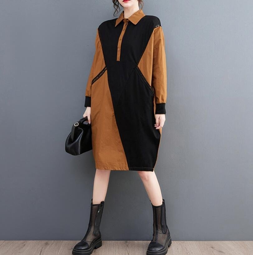 Fサイズ■春新品 レディース チュニック シャツワンピース 膝丈 配色柄 長袖 綿 シャツチュニック 大人可愛い★カーキ [浏览原始页面]