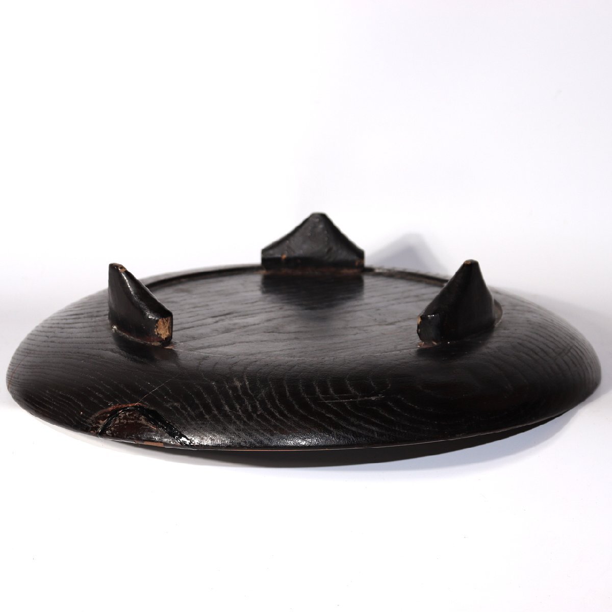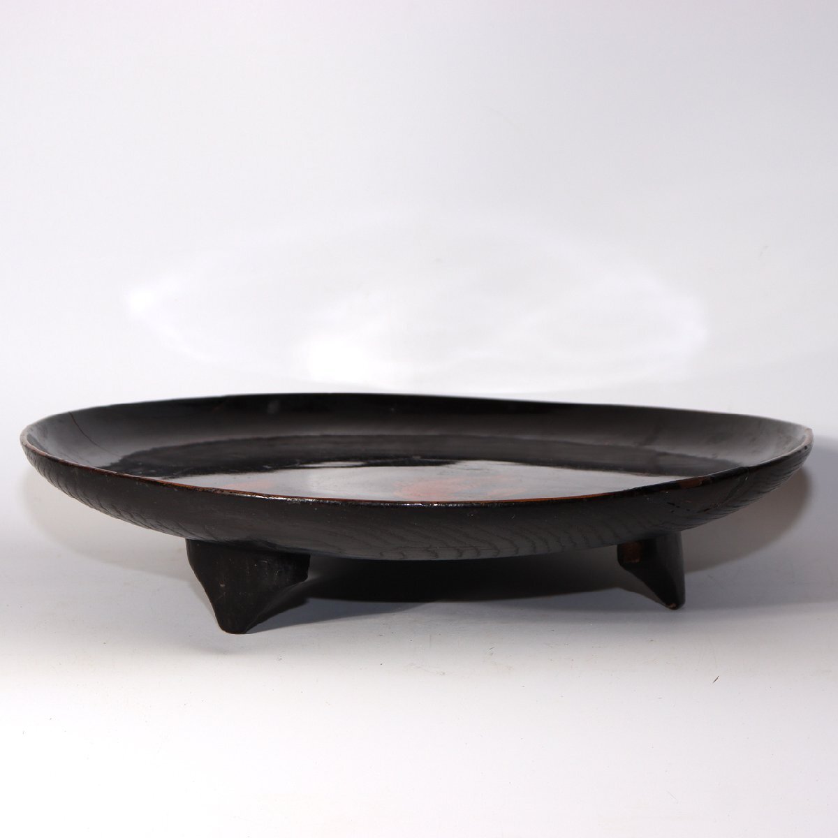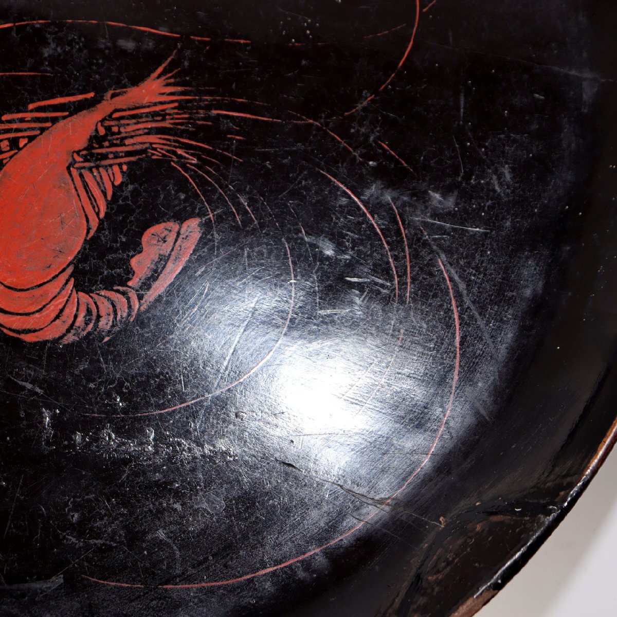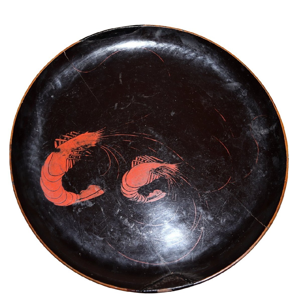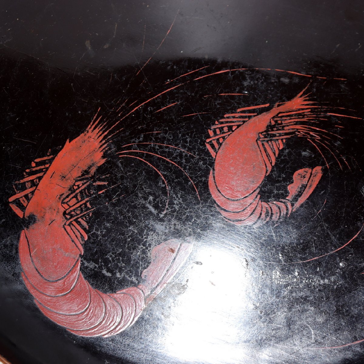 ◆ 商品説明黒漆塗の膳に朱色の海老蒔絵が施された作品です。三本足の高台を持ち、安定感と装飾性を兼ね備えています。 木地に漆を塗り重ね、光沢ある黒漆面に鮮やかな朱で描かれた海老の図柄は、シンプルながら力強い存在感を放っています。 【サイズ】 直径:約32cm(約12.6インチ) 高さ:約6.5cm(約2.6インチ) 重量:約460g 【状態】 縁に修理があり、二か所縁から内側に向かい割れがあります。 補修跡や経年の使用感があります。 当方は骨董品を中心に取り扱っており、安心してお取引いただけるよう丁寧な対応・梱包を心がけております。 ◆ 商品について