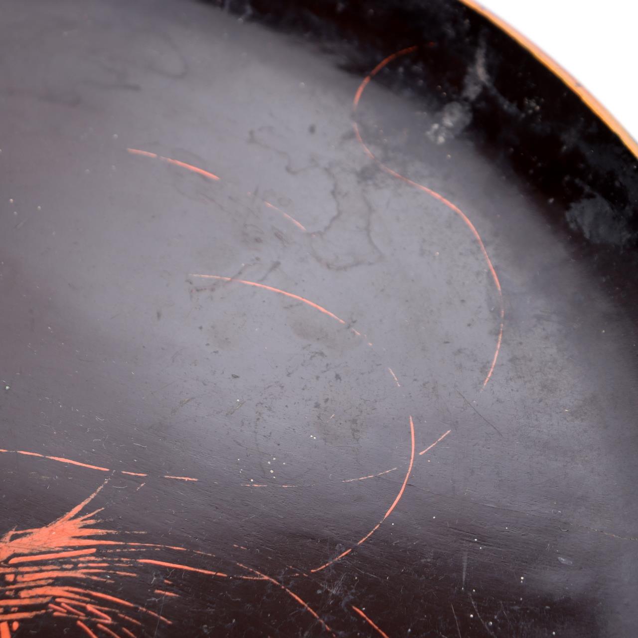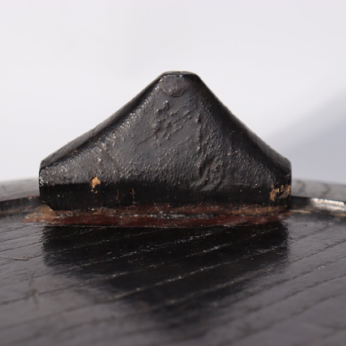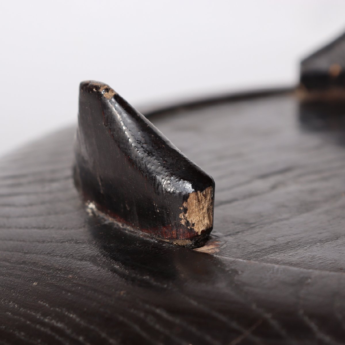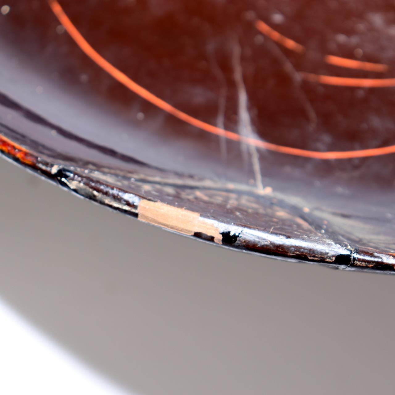 ◆ 商品説明黒漆塗の膳に朱色の海老蒔絵が施された作品です。三本足の高台を持ち、安定感と装飾性を兼ね備えています。 木地に漆を塗り重ね、光沢ある黒漆面に鮮やかな朱で描かれた海老の図柄は、シンプルながら力強い存在感を放っています。 【サイズ】 直径:約32cm(約12.6インチ) 高さ:約6.5cm(約2.6インチ) 重量:約460g 【状態】 縁に修理があり、二か所縁から内側に向かい割れがあります。 補修跡や経年の使用感があります。 当方は骨董品を中心に取り扱っており、安心してお取引いただけるよう丁寧な対応・梱包を心がけております。 ◆ 商品について