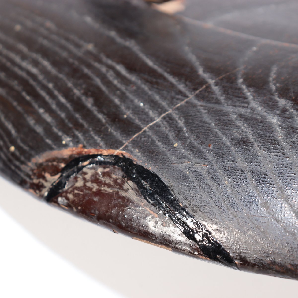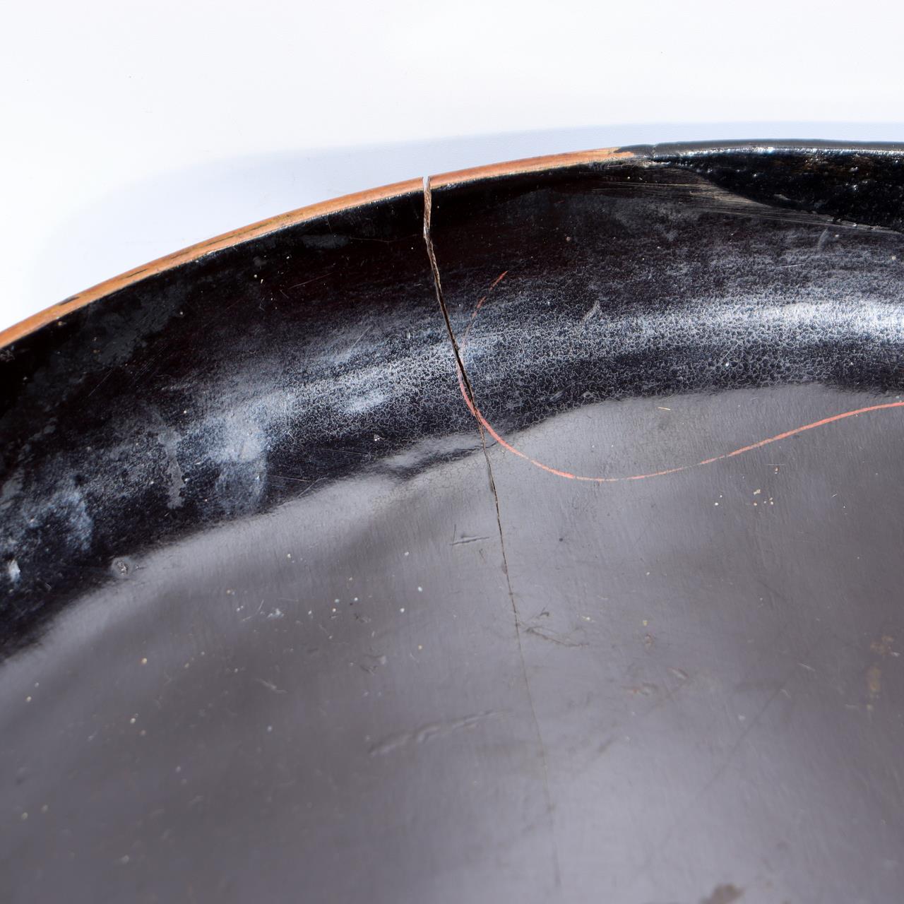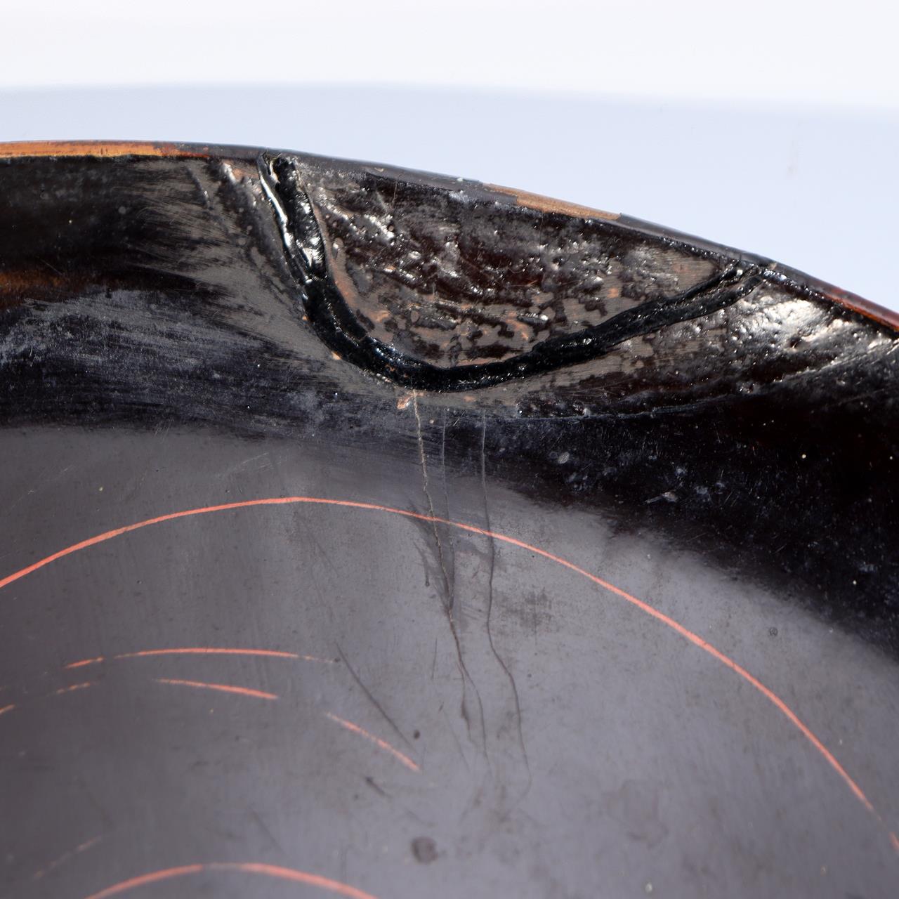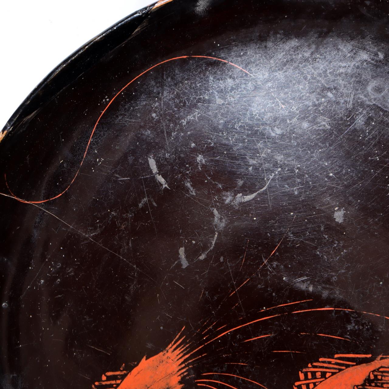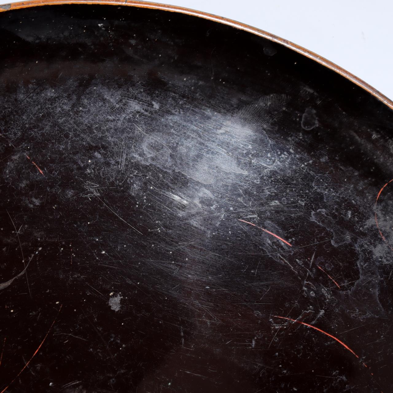 ◆ 商品説明黒漆塗の膳に朱色の海老蒔絵が施された作品です。三本足の高台を持ち、安定感と装飾性を兼ね備えています。 木地に漆を塗り重ね、光沢ある黒漆面に鮮やかな朱で描かれた海老の図柄は、シンプルながら力強い存在感を放っています。 【サイズ】 直径:約32cm(約12.6インチ) 高さ:約6.5cm(約2.6インチ) 重量:約460g 【状態】 縁に修理があり、二か所縁から内側に向かい割れがあります。 補修跡や経年の使用感があります。 当方は骨董品を中心に取り扱っており、安心してお取引いただけるよう丁寧な対応・梱包を心がけております。 ◆ 商品について